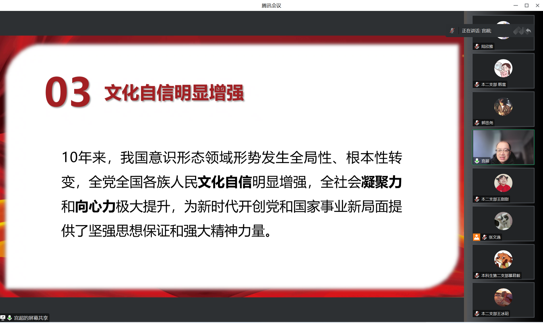 其次,宫书记从五个方面向党员同志们阐述了新时代十年的伟大变革:经济实力上新台阶、民主政治全面推进、文化自信明显增强、人民生活持续改善、美丽中国步伐坚实。并分别举例具体说明中国人民在全面建设社会主义现代化国家、全面推进中华民族伟大复兴事业中取得的伟大成就。