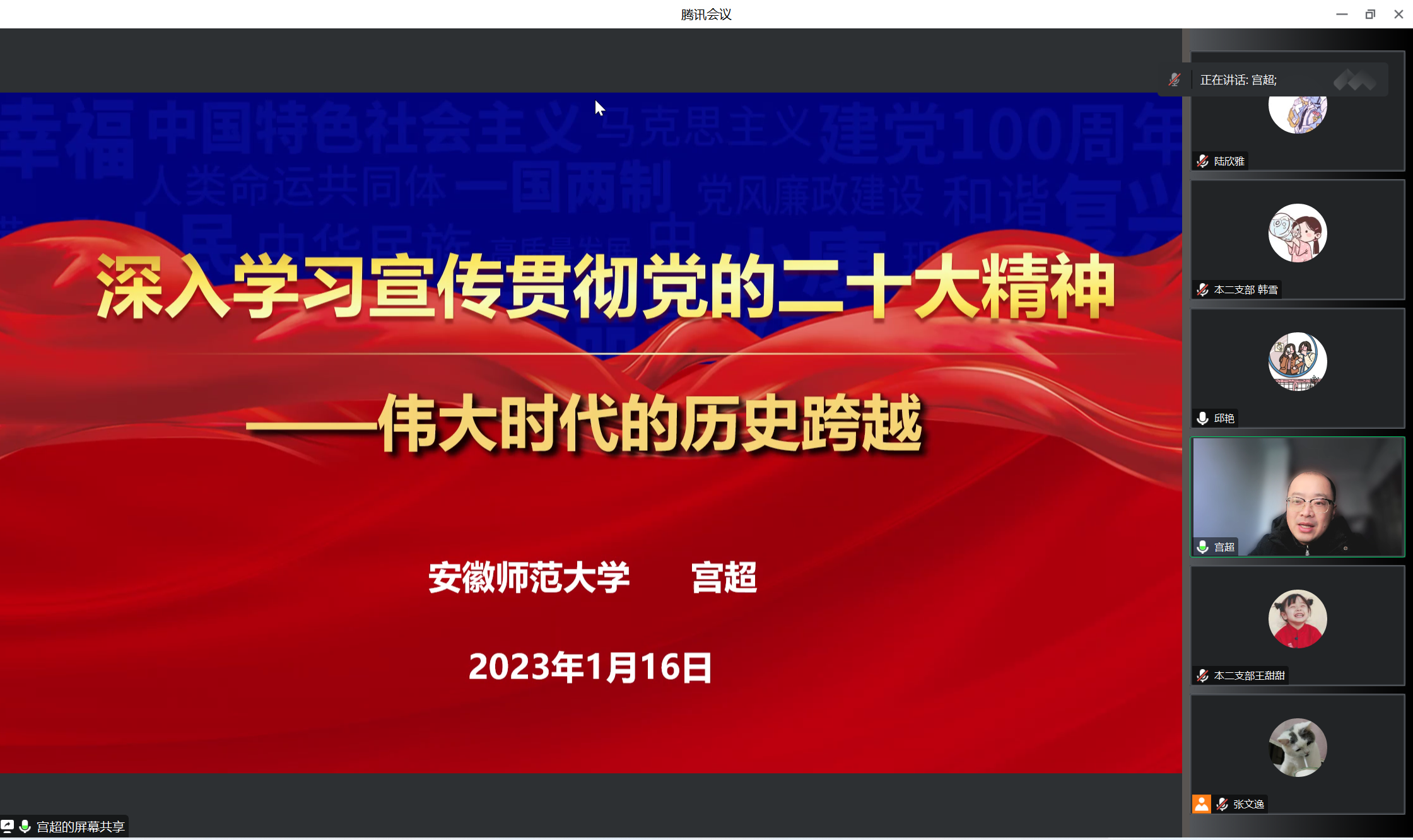 (本网讯 英国上市公司365陆欣雅)为推动员工深入学习和贯彻党的二十大精神,引导广大新时代青年坚定信念听党话、跟党走,英国上市公司365在2023年1月16日举办了深入学习宣传贯彻党的二十大精神宣讲会。本次宣讲由公司党委副书记、本科生第一党支部书记宫超主讲,全体本科生党支部成员参加。