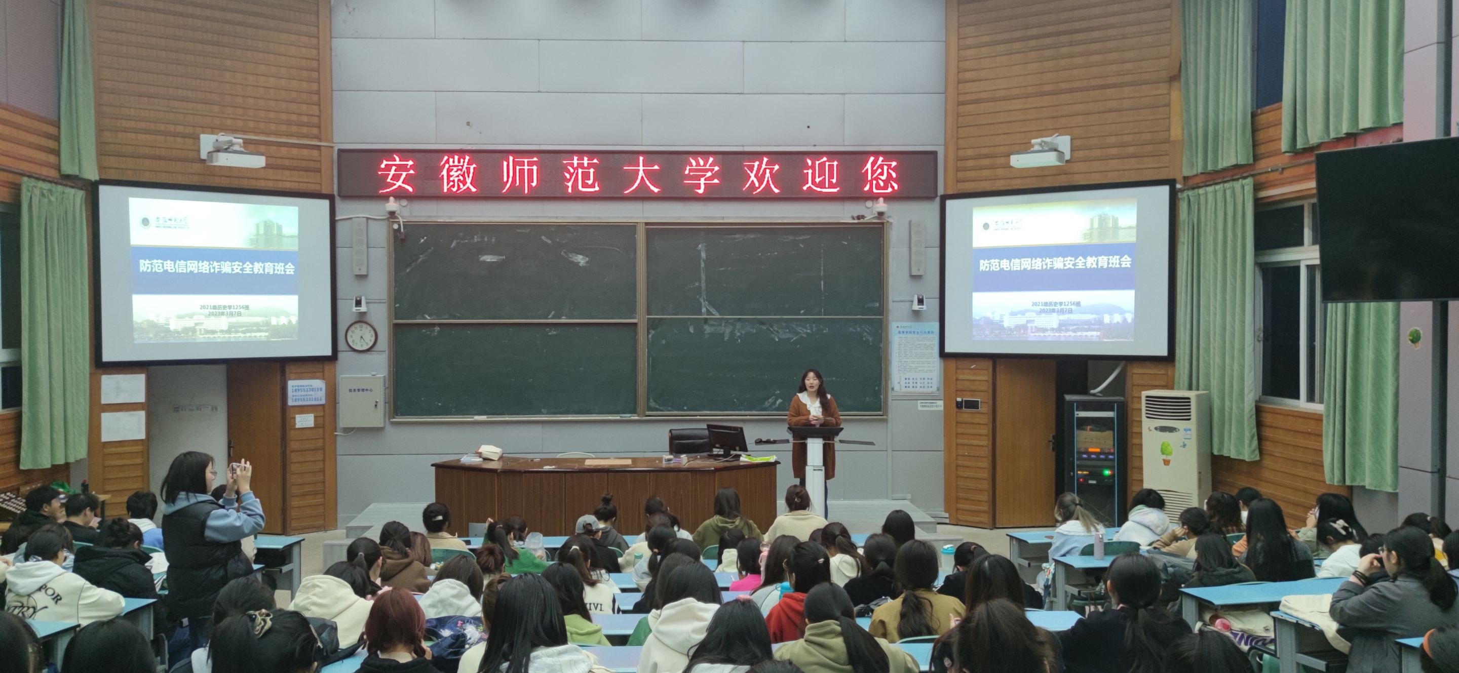 本网讯 (图/文 王施琦)为了扎实做好电信诈骗防范工作,进一步增强员工自我保护意识,筑牢校园安全屏障, 21历史师范教学一三班全体同学于2023年3月7日晚在2010105教室开展防范电信网络诈骗安全主题班会。班会由辅导员韩雪主持。