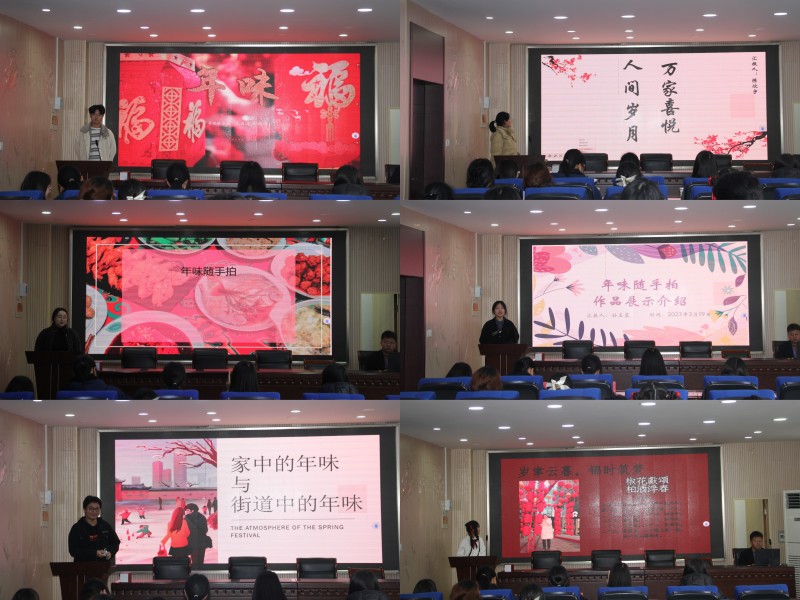 经过初赛评选,共有10名同学进入决赛。在决赛中,选手们以演讲的方式结合PPT展示家乡年味,并为大家讲述了照片背后的温馨故事,阐释了作品的思路。象征团团圆圆的炸圆子、祈求来年好运的春联、寓意阖家欢乐的花灯……每张精美巧妙的照片,每段别具匠心的视频,都让现场观众身临其境,感受不同的年味风俗。从省外到省内、从乡村到都市,区域不同、文化习俗不同,相同的是家乡浓浓的年味与温馨的情感。