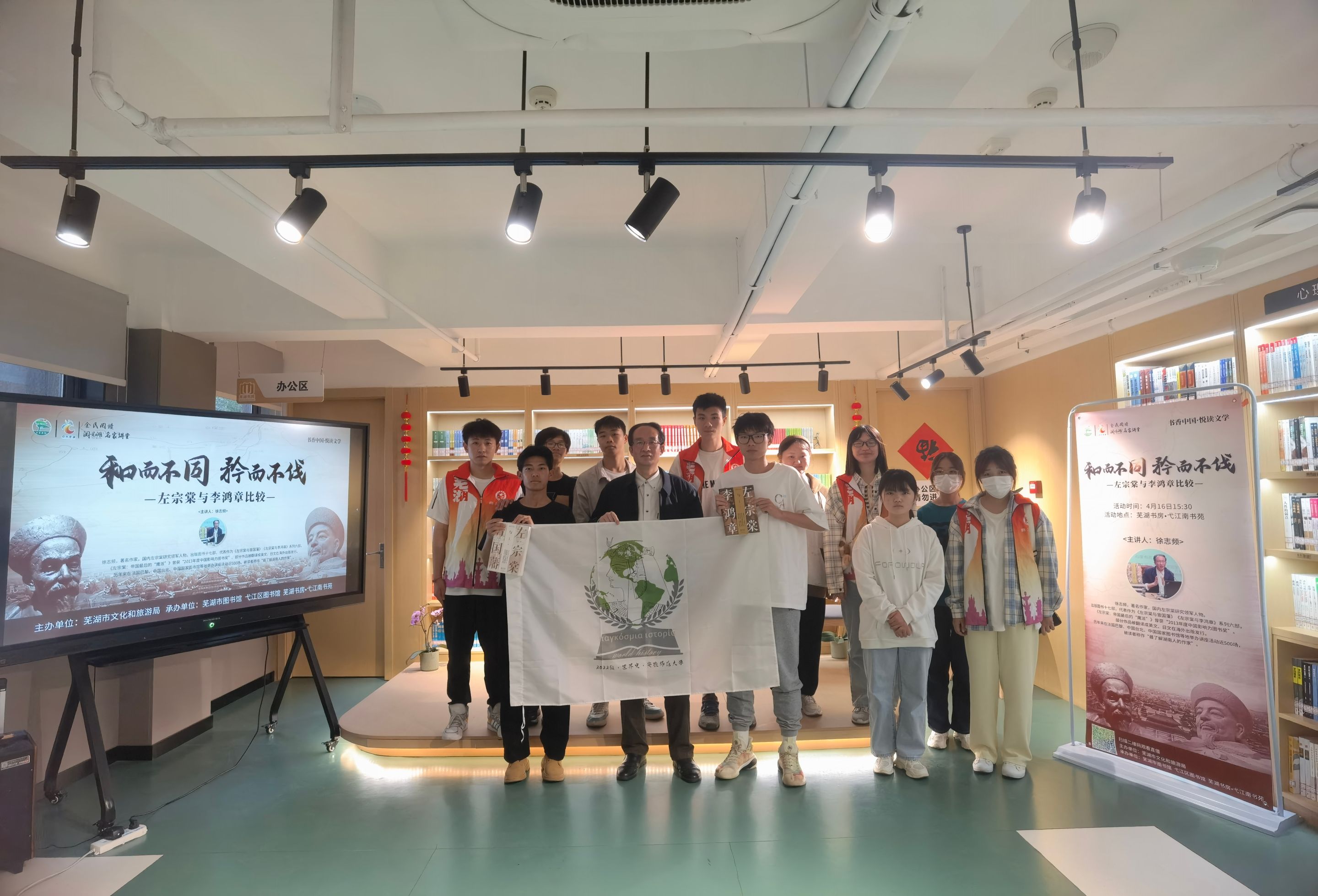 本网讯(文/图 宋子豪)为加强班级思想建设,坚定理想信念,牢固树立爱国主义精神,同时加强班级同学志愿服务精神,2022级世界史1班于4月16日,在班委与团支委的牵头下组织班级成员前往弋江南书苑,参加“和而不同,矜而不伐——左宗棠与李鸿章比较”讲座,并作为志愿者积极协助讲座的开展。
