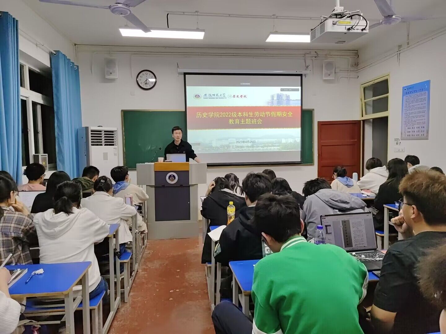 班会伊始,王宗双通过提问互动方式,为同学们简单介绍了劳动节的由来。接着,他向同学们通知了公司关于五一劳动节放假的安排以及相关要求,说明了假期请假的具体流程,提醒大家要严格遵守放假规定。同时,王宗双着重强调了假期安全教育,他围绕假期出游安全,居家安全,交通安全,防范网络电信诈骗等方面,对各类安全知识,安全注意事项等作出细致讲解。此外,王宗双还提醒同学们假期中要保持联络通畅,如遇特殊情况或有特殊需求,要及时反映报告给家长与辅导员。最后,王宗双给同学们提供了五一小长假的建议,治学以明智,劳动以育德,他鼓励同学们积极主动地参与家务劳动,做一些自己力所能及的事情。
