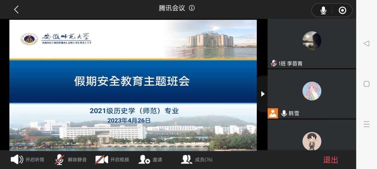 班会伊始,辅导员主要强调了假期离校和留校的安全问题,要求同学们重视寝室安全、交通安全、居家安全、假期安全,做到安全出行、安全游玩、安全留校。同时要求离校同学严格履行请假手续,留校同学严禁晚归不归,寝室长要做好每天的报寝、班委做好在校人员核对。会上还特别进行了防溺水、防诈骗、文明上网理性发声专题教育。班会末,辅导员提出希望同学们要保持清醒头脑,端正思想,遵守校规校纪,牢记安全第一,度过快乐五一!