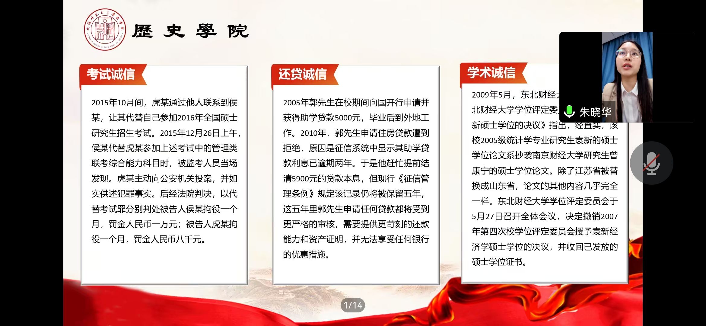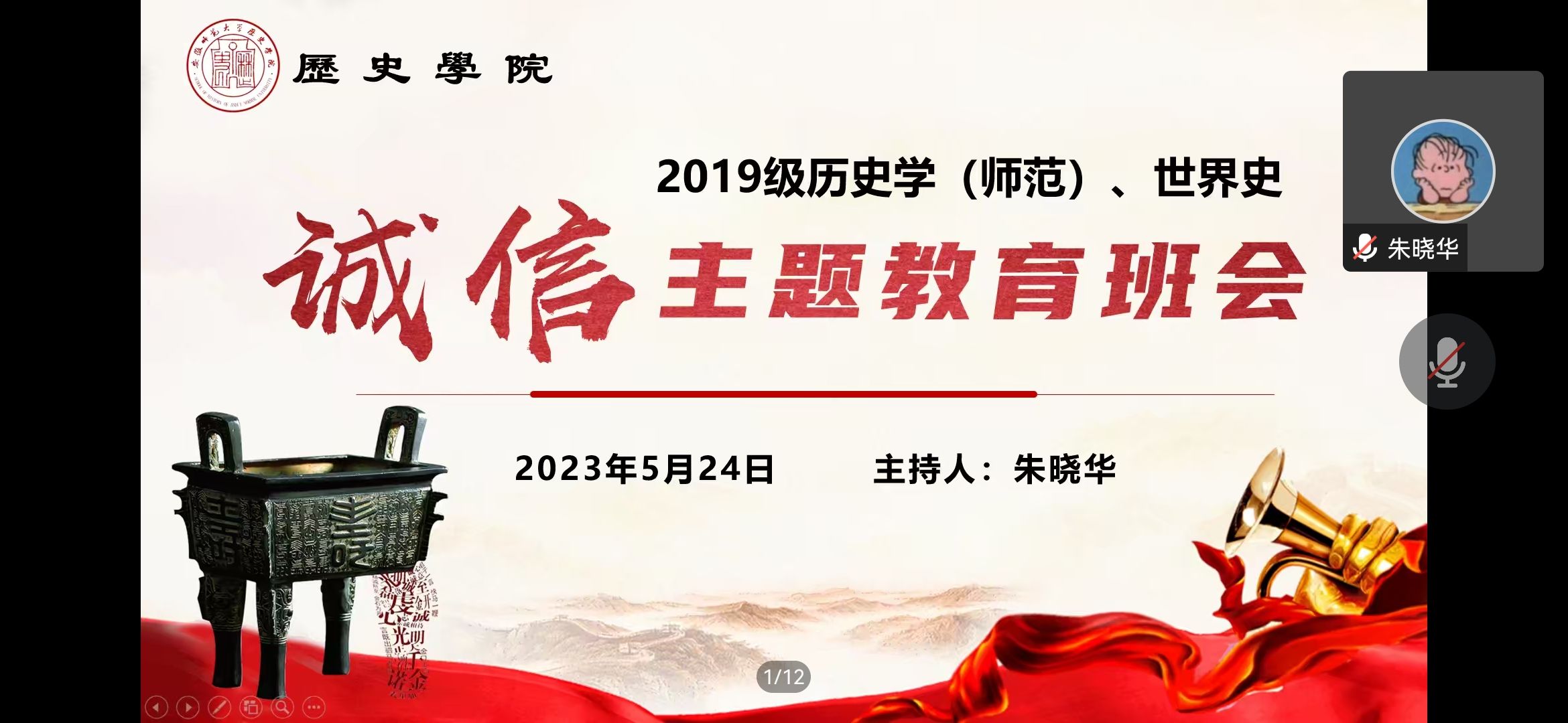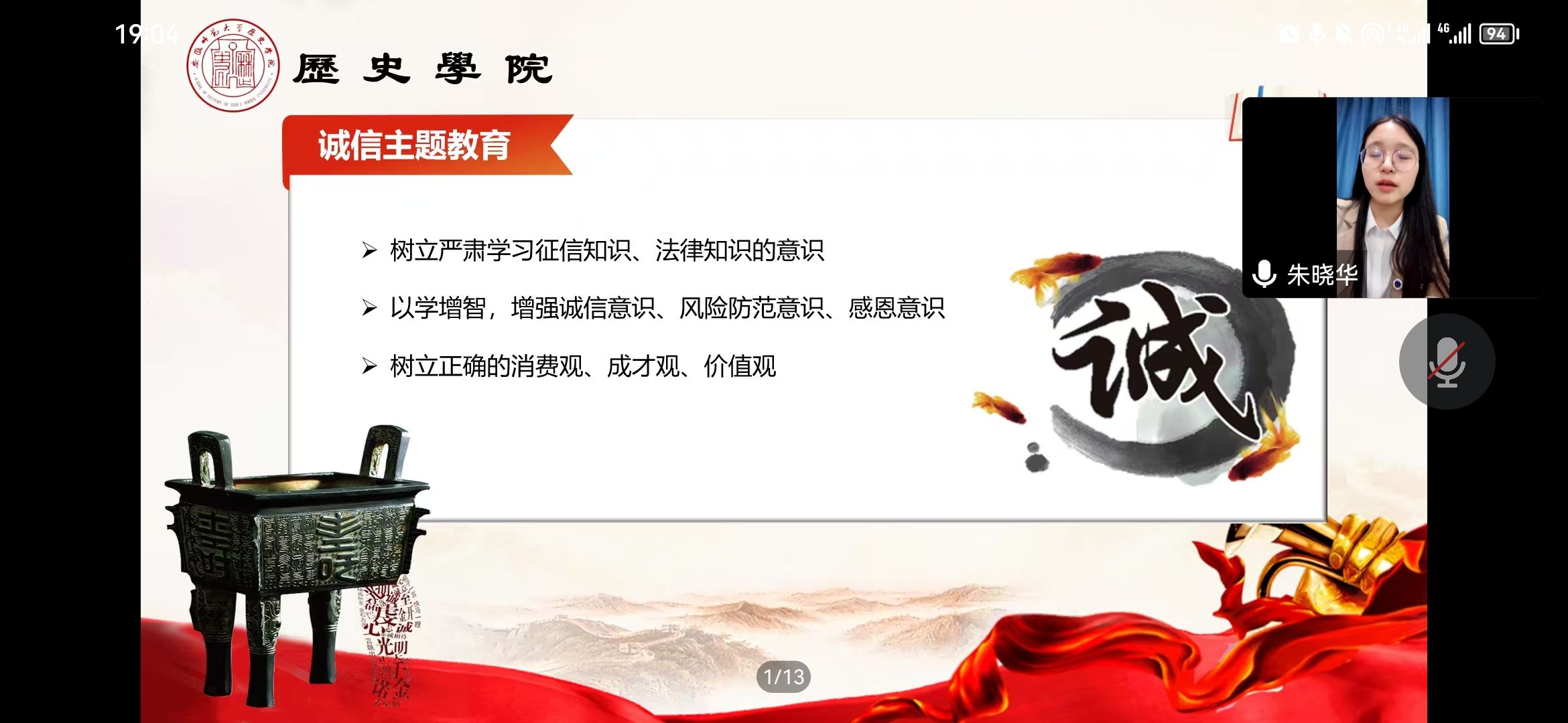 本网讯(图\文/ 19历史刘燕杰)为培养员工诚信意识,提醒同学们诚实守信,促进诚信成为员工共同的价值和行为准则,5月24日晚上,辅导员朱晓华召开了19级历史学、世界史诚信主题教育班会,历史学、世界史全体同学线上参加。