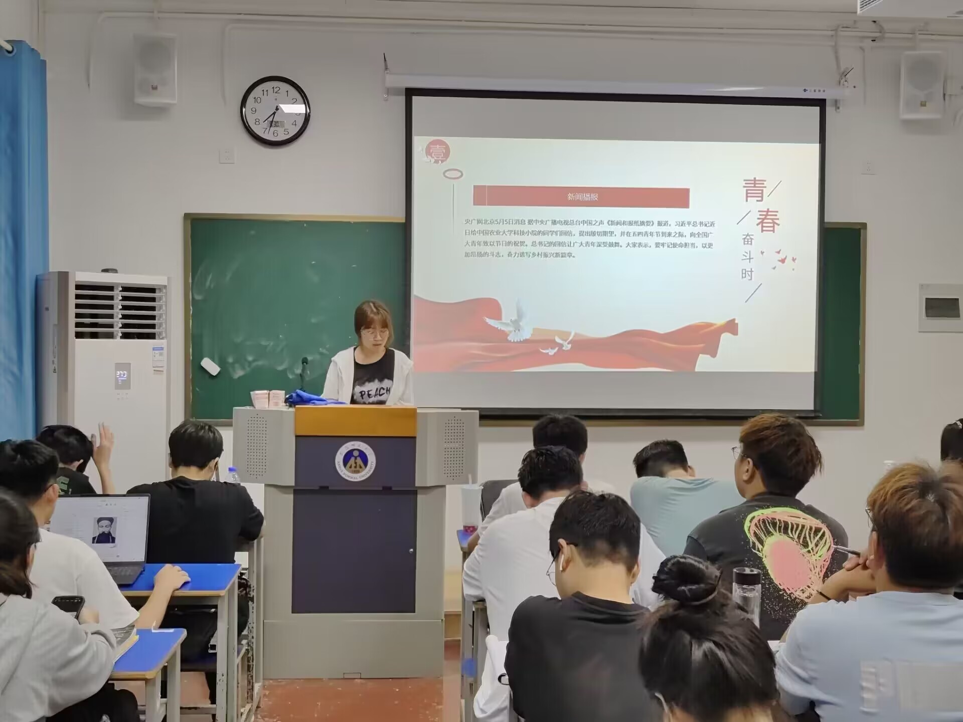 本次活动由素拓委员夏婷同学主持,2022级历史学(师范)2班全体团员积极参加。活动主要从三个方面展开。第一部分,夏婷为同学们播放《新闻联播》中习近平总书记给中国农业大学科技小院回信的相关报道。结合新闻报道,她依次介绍科技小院给习近平总书记写信的背景,以及习近平总书记回信的重要内容;第二部分,夏婷为同学们重点介绍了中国农业大学科技小院的优秀硕士对习近平总书记回信的真切感悟。农学子弟应深入田间地头,用自己所学知识,解决实际生产上遇到的问题,实事求是地助力农业的发展,更好地助力乡村振兴;最后,结合回信的内容,对新青年提出新的时代要求。当代中国青年生逢其时,施展才干的舞台无比广阔,实现梦想的前景无比光明。把党的二十大擘画的宏伟蓝图变成美好现实,需要呼唤广大青年一步一个脚印向前进,一点一滴扎实干,用奋斗创造让世界刮目相看的新奇迹。