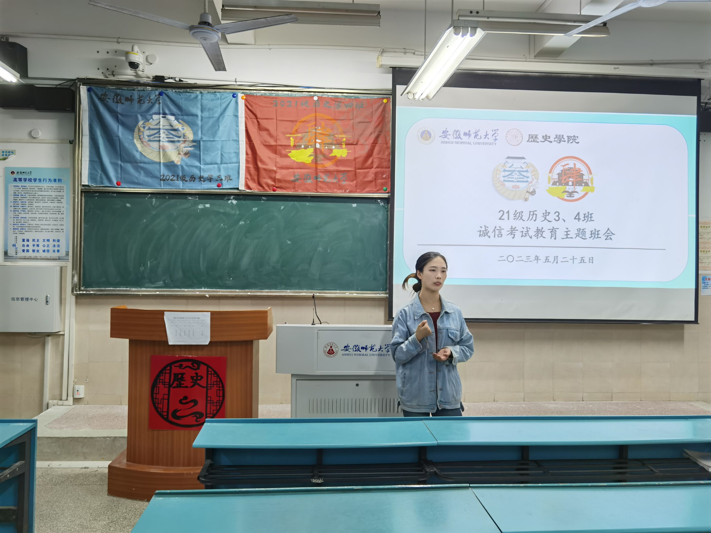 本网讯(图/文 陆欣雅)为了全面贯彻落实公司诚信教育的要求,形成良好的班风班纪。21级历史学3、4班于5月25日在2040102教室召开诚信教育主题班会。本次班会由辅导员张文逸老师主持,3、4班全体同学参加。