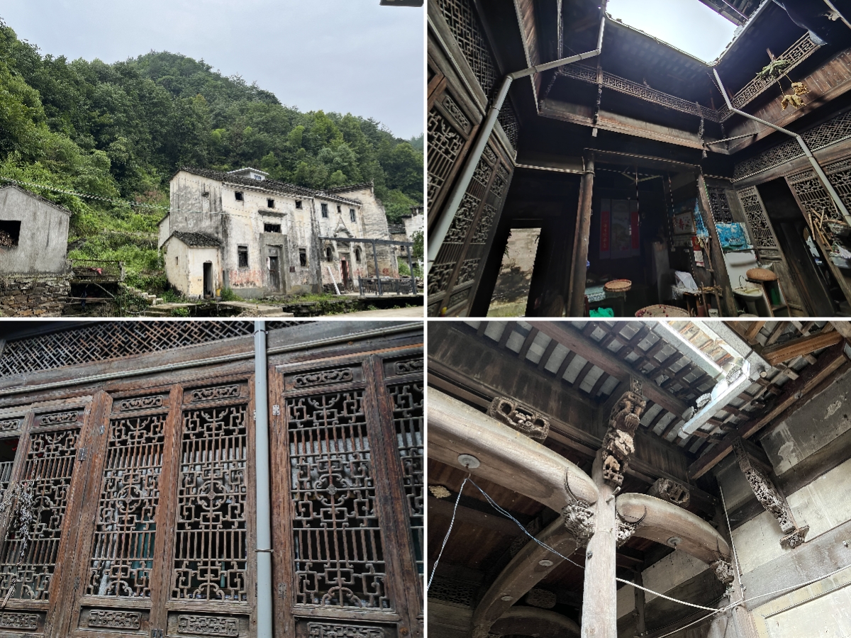 一行人首先来到琶坑村,村中小溪的尽头便是本次调研的4处古民居,分别是“汪继根宅”、“汪明生宅”、“汪清峰宅”以及“汪庆平宅”,均由歙县政府挂牌保护。但4处古民居因疏于管理,门前屋内杂草丛生,青苔遍布,更甚者外墙有明显裂缝,与村中老人交谈得知其有一处古民居门楼遭贼盗窃,现存状况堪忧。随后团队来到定潭村,该村毗邻新安江,调研队分为两个小组分头行动,以人物访谈的方式,共探访了6处古民居。其中有2处为当地政府挂牌保护,剩余4处古民居未挂牌,外观整体保存完好,可惜都落锁无人居住,未能进入古民居一饱眼福。