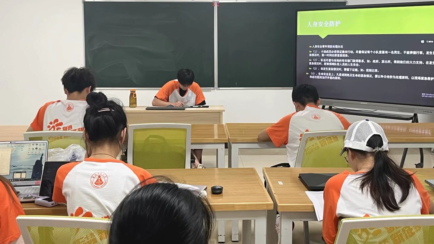 会议围绕安全防护问题展开,一共分为两个大部分,分别是日常安全防护和人身安全防护。首先,徐佳老师据日常安全防护方面,结合往年调研经验着重强调注意天气预报,出行带好双肩包,备好雨伞以及必需品,做好防晒,如遇雨天出行注意安全,谨防摔倒。