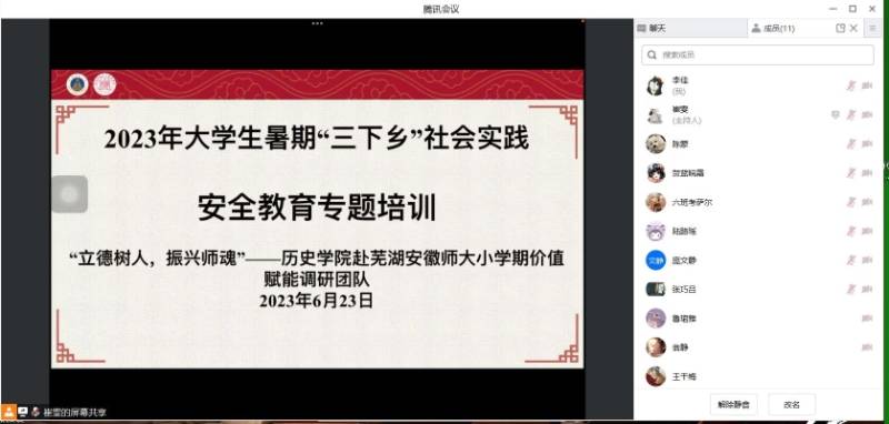 本网讯(图/李佳 文/汝玲珑)为了确保暑期实践期间的安全,6月25日晚,“立德树人,振兴师魂”——英国上市公司365赴芜湖安徽师大小学期价值赋能调研团队开设了线上团队安全会议,团队负责人就暑期实践期间的安全问题进行了详细的讲解和部署,全体队员参与视频会议。