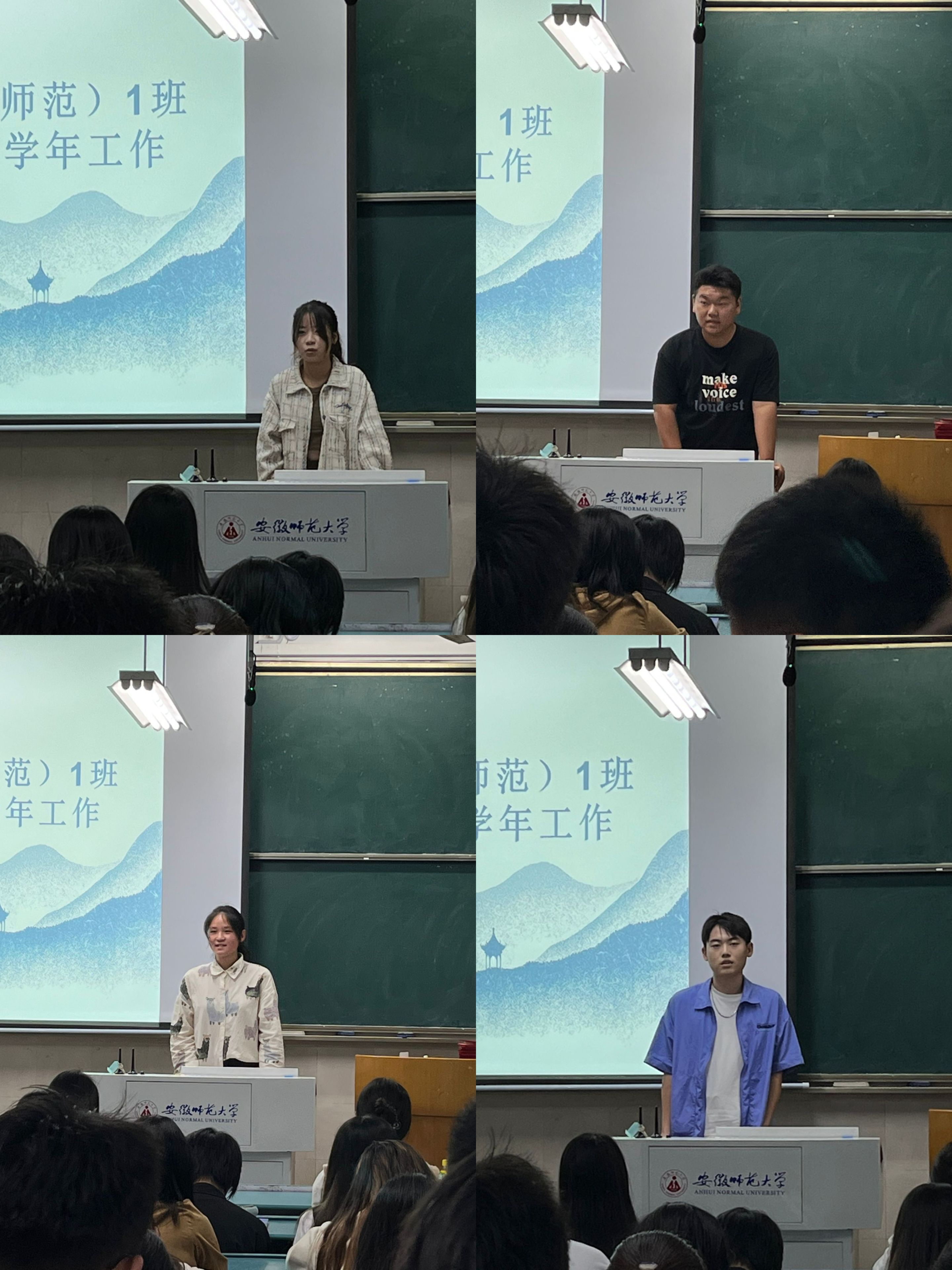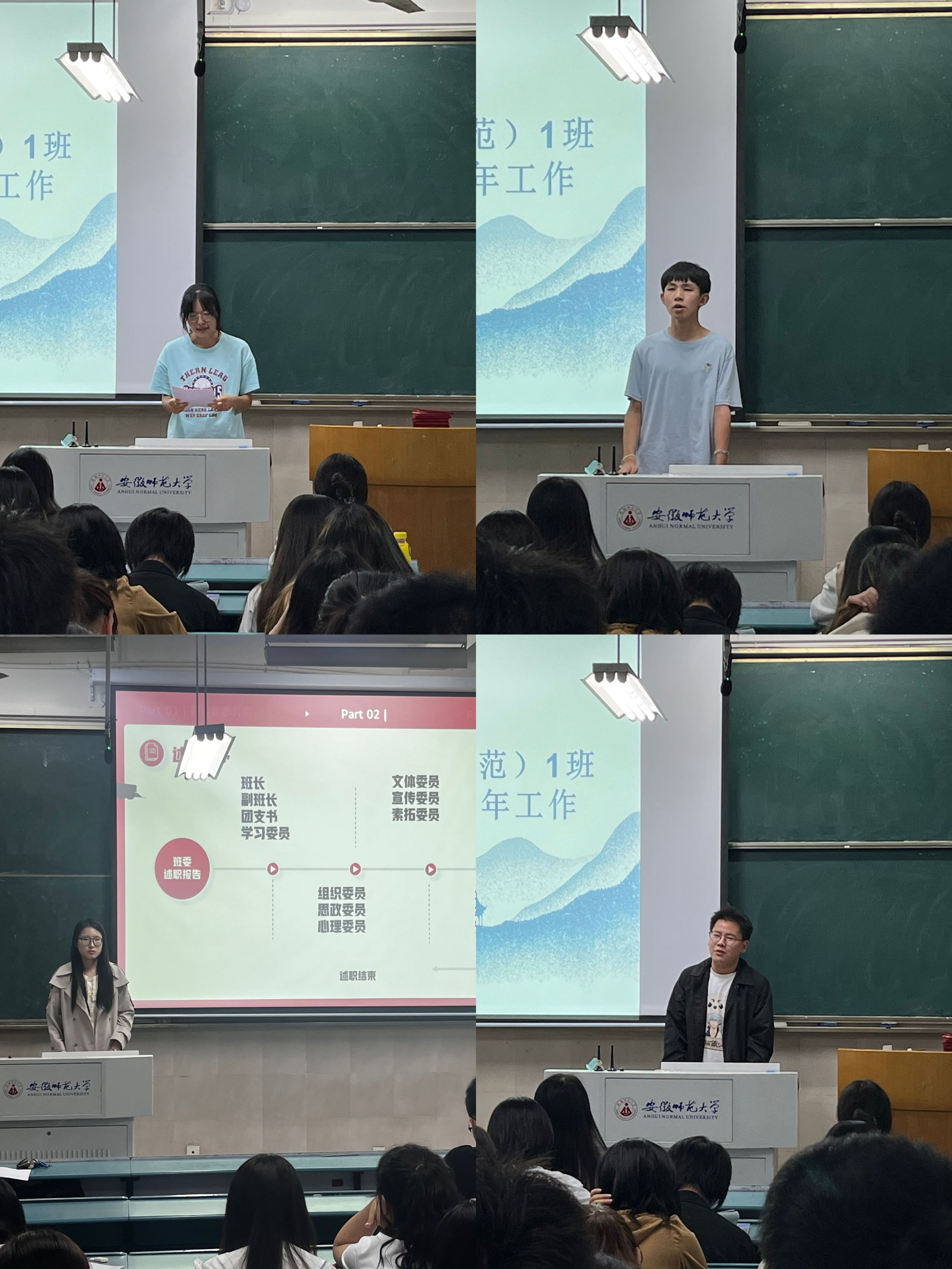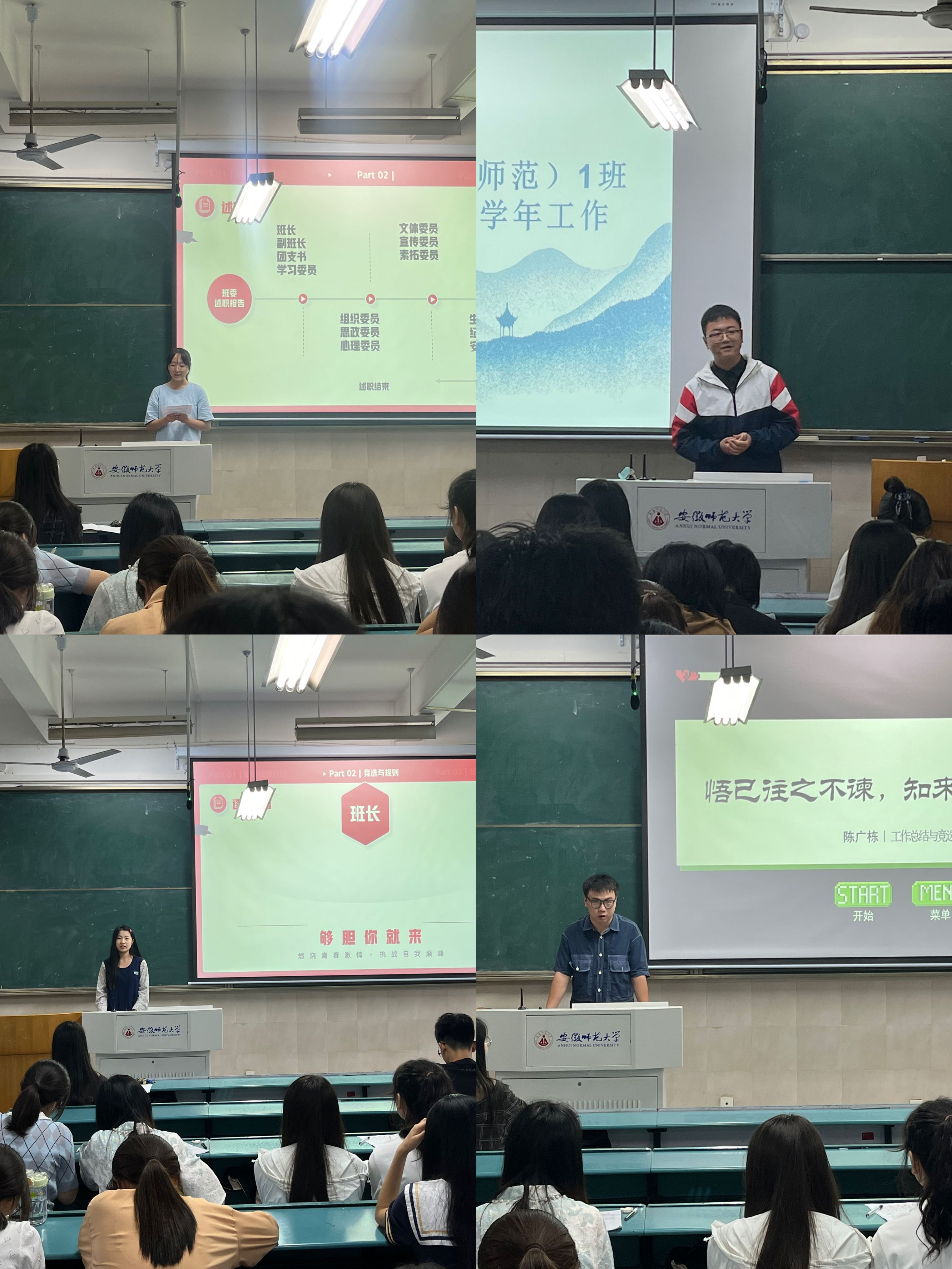 本次会议共分四项议程进行。首先,由各班干上台总结任职一年以来的工作,分别总结自己在任职一年中的成长与收获、为班级建设做了什么工作、自身有什么成就和不足等。紧接着,各班干汇报完后便进行班干的换届竞选,有意向竞选新班干的同学上台发言,明确表达自己的竞选意愿和竞选优势。有的同学表示自己以前担任过相关职位的班干,经验丰富,能胜任该职位;有的同学则想借此机会锻炼自己,充实自己的老员工活;有的同学本着一颗乐于助人的心,愿为班级建设发展贡献自己的力量。