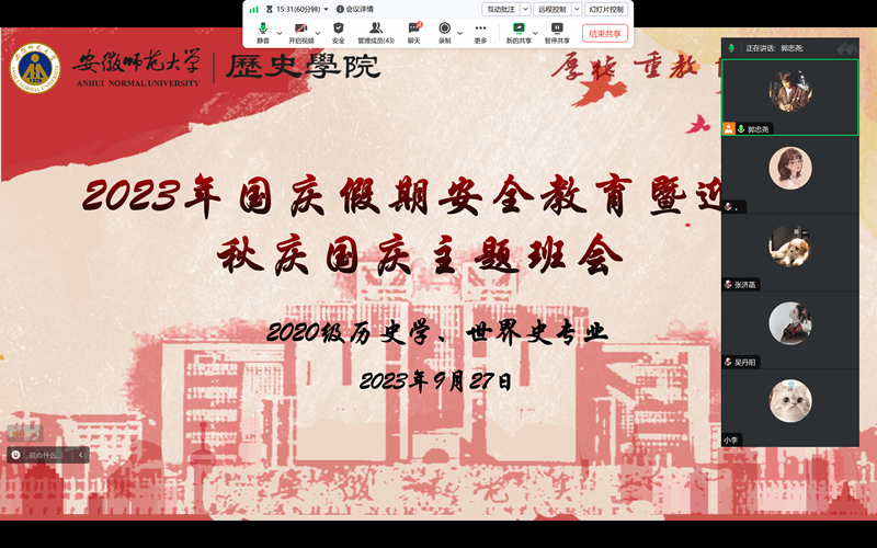 本网讯(图文/关雨露)在中秋、国庆双节来临之际,为加强爱国主义教育,培养同学们的爱国意识和民族责任感,也为了让全体同学度过一个安全、健康、充实、欢乐的假期,增强同学们的安全意识,提高同学们的自我保护能力,筑牢安全防线,9月27日晚,2020级历史学、世界史专业通过腾讯会议召开了2023年国庆假期安全教育暨迎中秋庆国庆主题班会,会议由辅导员郭忠尧主持,全体同学参与。