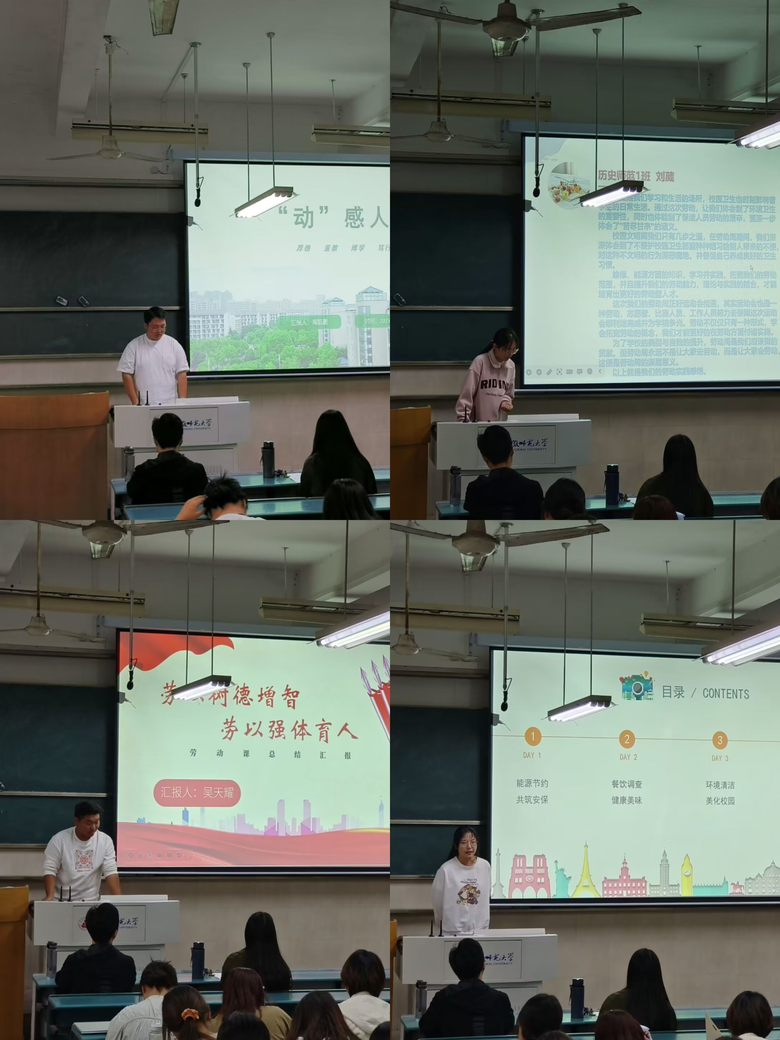 首先,由朱晓华老师宣布总结交流会正式开始。两班共六名同学分别代表六个劳动小组依次上台进行汇报发言。六位同学分别从本组的实际劳动情况出发,围绕“‘动’感人生”,“劳以树德增智,劳以强体育人”,“劳动为犁,深耕韶华”等主题向大家介绍了本组的劳动内容、劳动体验与劳动感悟。在汇报中,我们直观感受到各组在井盖维修、落叶清扫、绿化除草与电路实操等多方面发挥的智慧与付出的努力。部分同学也通过写感悟等形式向同学们分享了他们的心得体会,宣扬了劳动最光荣、劳动最崇高、劳动最伟大、劳动最美丽等新时代劳动观念。六位同学的汇报主题集中,内容明确,氛围诙谐轻松,同学们都报以热烈的掌声。
