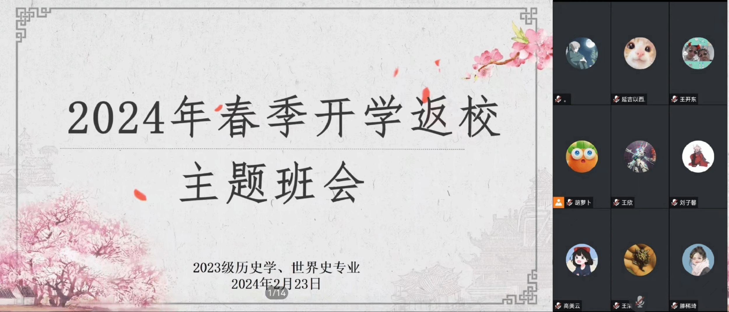 本网讯(图/文 23历史李佳颐)为迎接新学期的到来,帮助同学们及时调适学习和生活状态,为返校做好准备,英国上市公司3652023级辅导员胡文新于2月23日晚通过腾讯会议召开了2024年春季开学返校主题班会,2023级历史学、世界史专业全体同学参加。