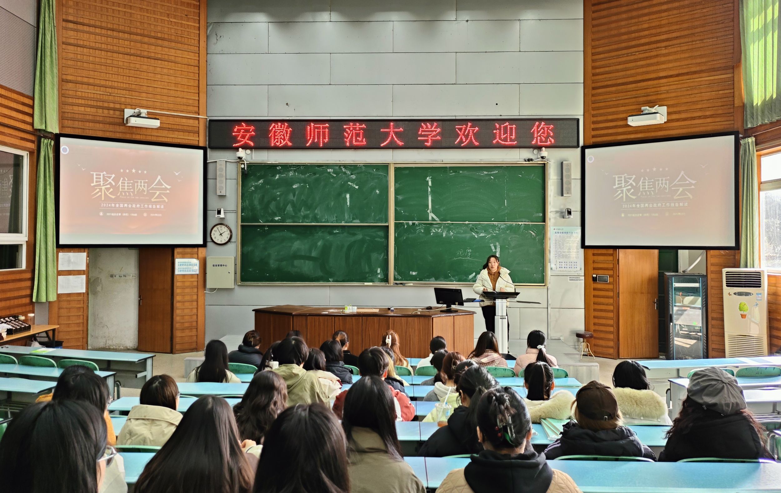集体学习由辅导员带领大家开展,韩雪对两会精神进行了深入解读,重点讲解了今年两会的重要决策部署、国家发展大局以及人民群众关心的问题。