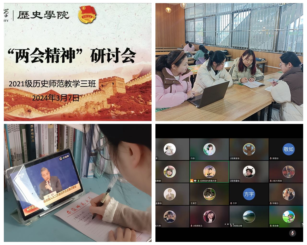 研讨会上,大家分别阐述了今年两会的背景、重要议题和具体措施,对两会期间提出的新思想、新观点进行了深入探讨。2021级历史学思政委员赵欣如同学说:“推进非物质文化遗产保护传承”今年两会政府工作报告中对文化传承与发展提出了新的目标。作为历史学(师范)专业的员工,我们要在历史研究中从身边、从家乡着手,深耕文化热土,挖掘文化资源,实践文脉传承;也要在今后的历史教学中融汇中华文化,让文化活起来,播撒文化之种,代代相继,生根发芽。