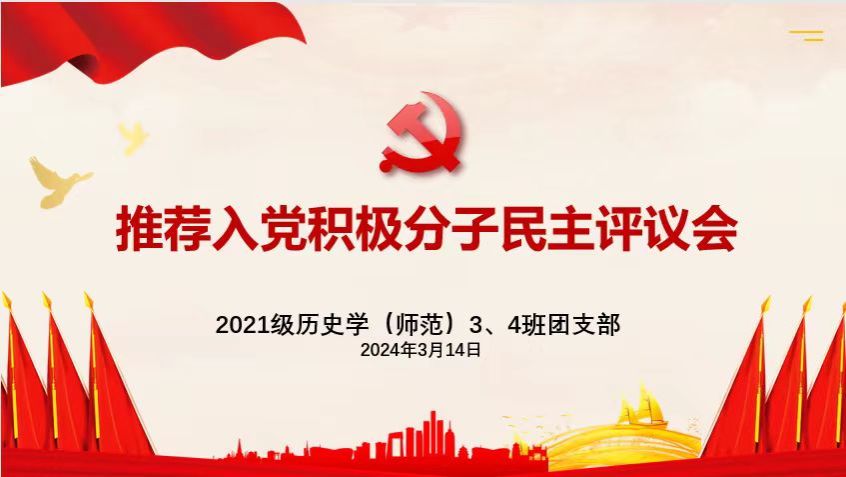 本网讯(马轻灵)中国共产主义青年团是中国共产党领导的先进青年的群众组织,为进一步做好在我班优秀共青团员中推荐入党积极分子的工作,2021级历史学(师范)3、4班团支部于3月14日晚21时召开了入党积极分子推优大会。此次会议由团支书王睿、马轻灵主持,民主评议小组成员全体参与。