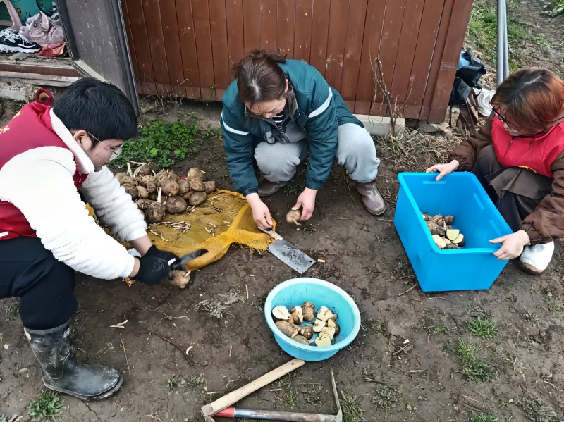 本次农田种植活动中,所选作物为土豆。种植过程涵盖切割种块、分篮装配及挖坑栽种等多个环节,流程繁琐且需精细操作。志愿者们不辞辛劳,全程投入,于广阔田野间挥汗如雨,与星星儿童并肩劳作。在广阔的土地上,志愿者们手拿铁锹,播种下一颗颗土豆种子。他们的双手虽然沾满了泥土,但这份泥土却见证了他们对雷锋精神的坚定传承和对土地、生命的热爱与尊重。随着最后一个土豆种子的入土,上午的农场活动圆满结束。