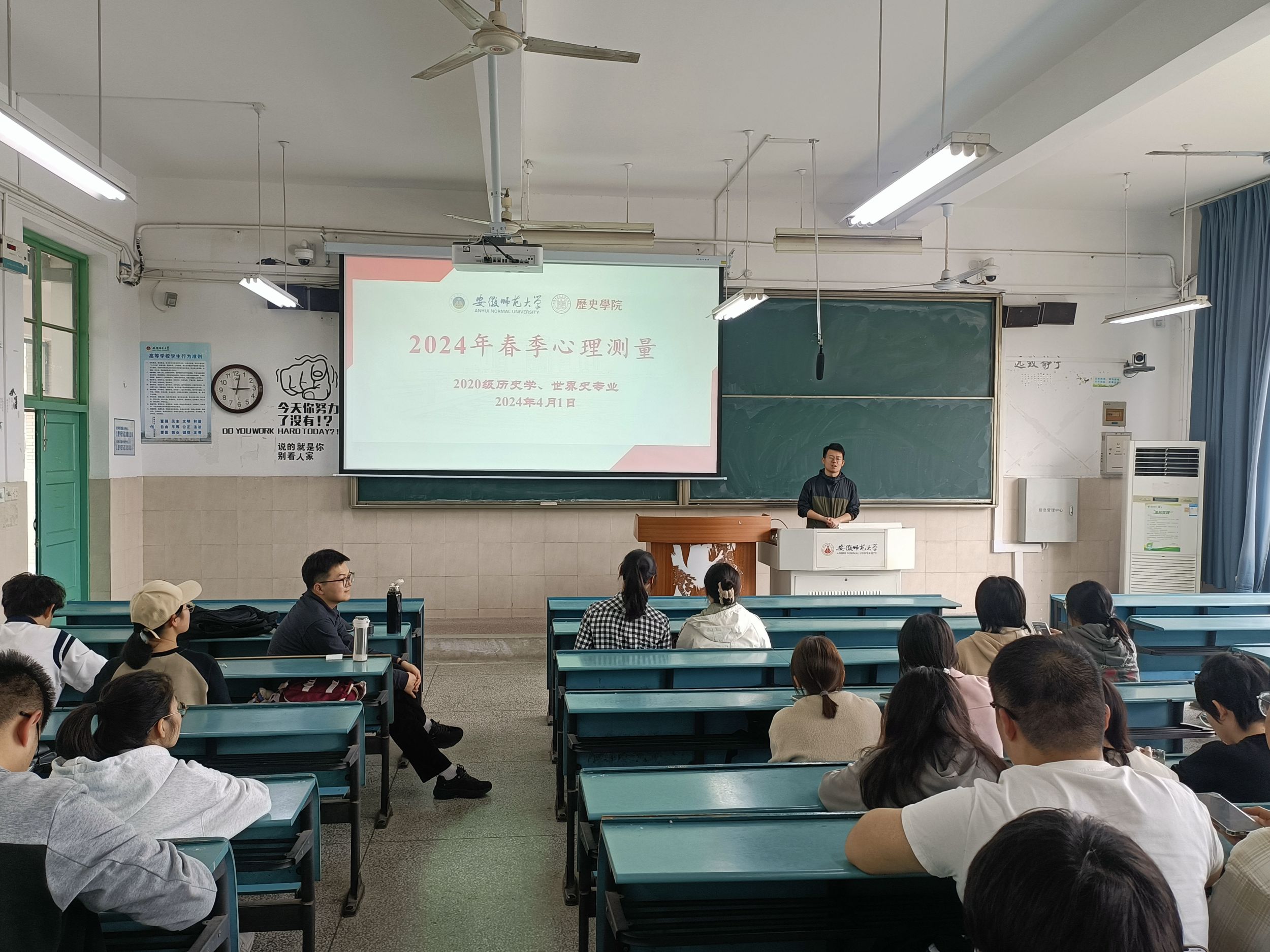 郭忠尧开展了春季心理健康教育,围绕毕业、考研、就业过程中的心态调适进行了详细讲解,号召同学们正视自己的心理需求,如有必要积极求助等,会上开展了心理测量。郭忠尧对毕业、考研、就业中的注意事项也进行了逐一说明。