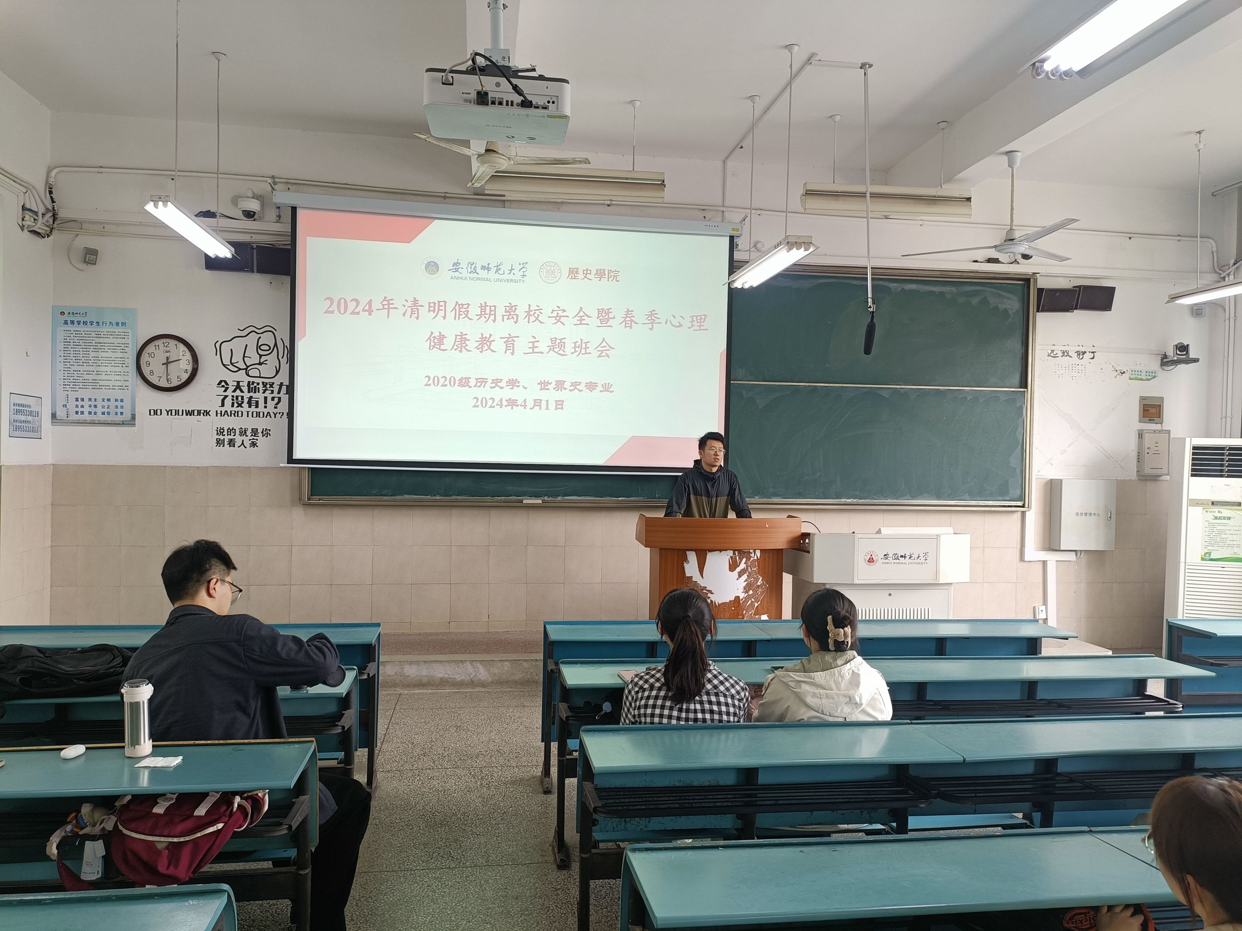 本网讯(图文/张水鸿)在清明节来临之际,为加强爱国主义教育和传统文化教育,让全体同学度过一个安全、健康、充实、欢乐的假期,增强同学们的安全防范意识,提高同学们的自我保护能力,筑牢安全防线,4月1日下午,2020级历史学、世界史专业于2050202教室召开了清明假期离校安全暨春季心理健康教育主题班会,同步使用腾讯会议直播,会议由辅导员郭忠尧主持,全体同学参与。