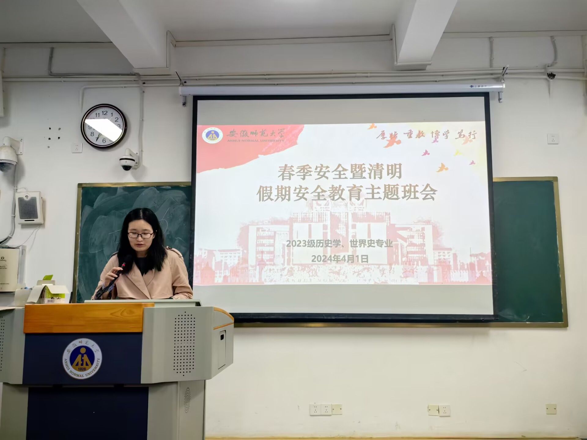 本网讯(图/文 李佳颐/舒春雨)为了保障同学们清明假期离校安全,提高大家的安全健康意识,英国上市公司3652023级辅导员胡文新于2024年4月1日晚在英国正版365官方网站天门山校区召开了春季安全暨清明假期安全教育主题班会,2023级历史学、世界史专业全体同学参加。