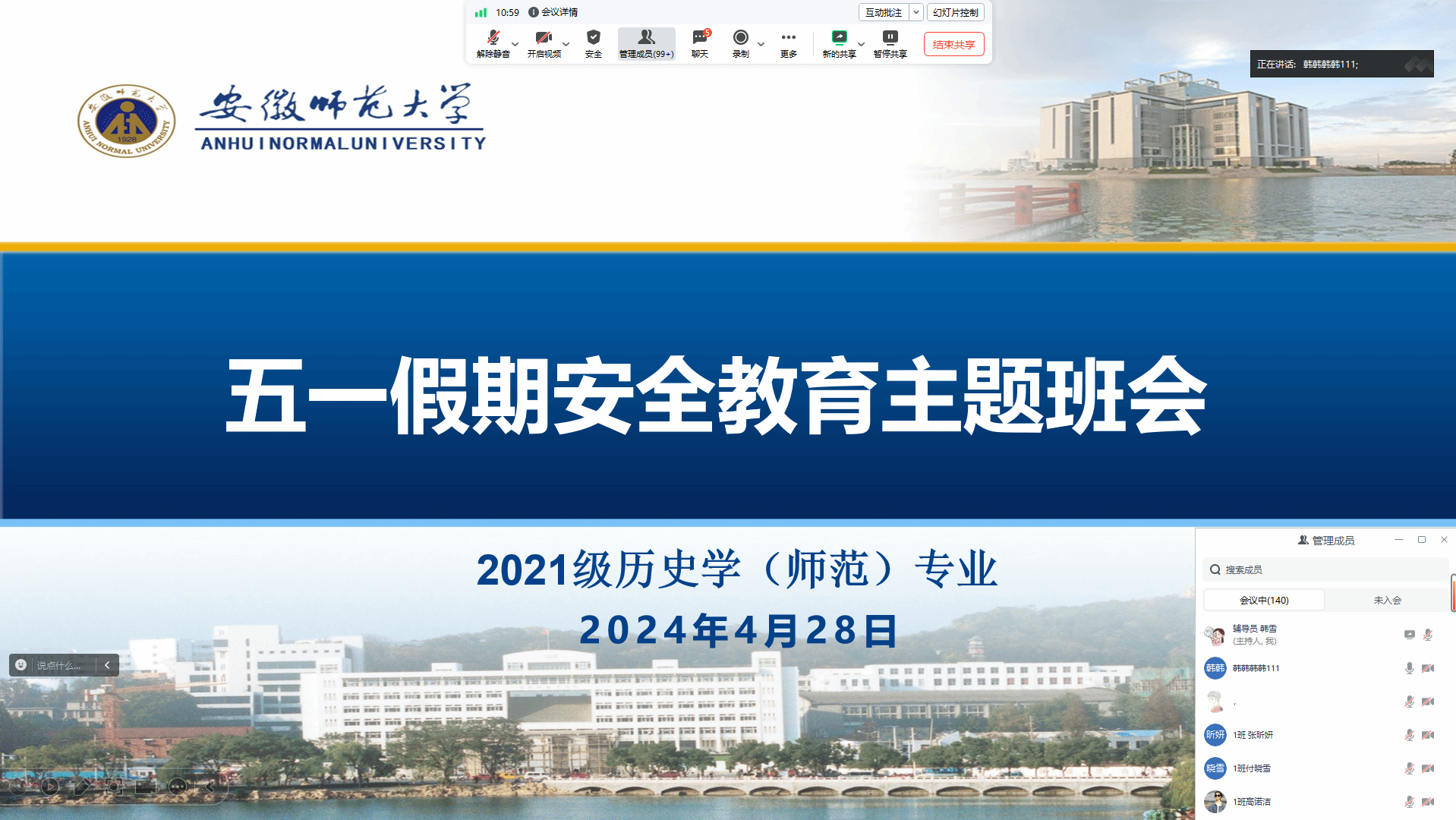 本网讯(图/文 李苗青)在五一假期来临之际,为了进一步增强同学们的安全防范意识,提高自我防护能力,21级历史学一三班于4月28日召开了以“假期安全,你我同行”为主题的五一假期安全教育班会。本次会议由辅导员韩雪主持,21历史学一三班全体同学参与。