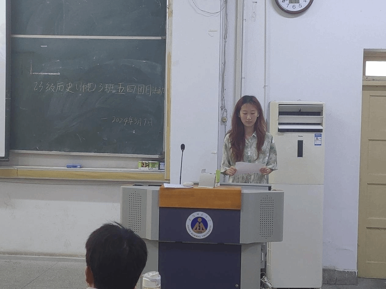 本网讯(图/文 谢熙瑶)为激发青年员工的爱国热情和创新精神,引导同学们为实现中华民族伟大复兴的中国梦贡献力量,在五四青年节来临之际,历史师范3班全体同学在辅导员胡文新的指导下于5月7日在行知楼105举办了“纪念五四爱国运动”主题团日活动,本次活动由团支书代洪莉主持,历史3班全体同学参加。