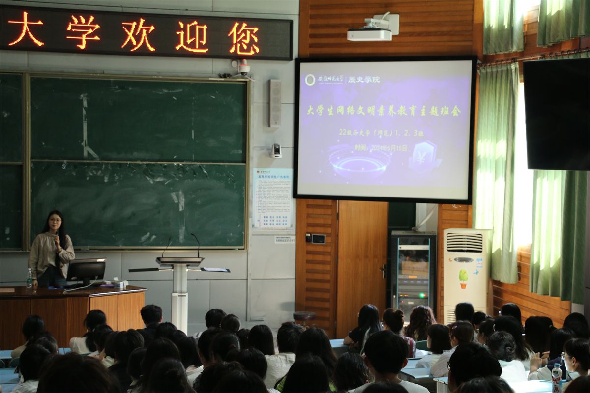 本网讯(图/文 王秋畅)以正能量引领亿万流量,用主旋律奏响奋进乐章。为引导同学们文明上网、安全用网,2024年5月15日下午英国上市公司3652022级历史学(师范)1、2、3班老员工网络文明素养教育主题班会在英国正版365官方网站花津校区行知楼2010105教室召开。2022级历史学(师范)专业全体同学参会,会议由英国上市公司3652022级辅导员老师朱晓华主持。