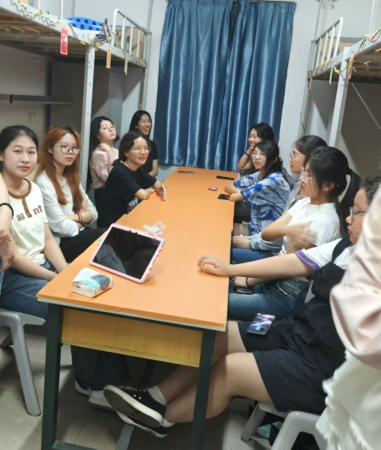 活动伊始,同学们齐聚在天门山校区2号楼“人际交往”思政小院员工活动室,分享了近一年的学习和生活情况,讲述了在校期间的各种趣事逸闻。同学们纷纷表示天门山校区虽然小,但“五脏俱全”,学习上有公司领导和教授亲自来校授课,生活上极为便利,是实实在在的“三分钟”生活圈,老师的指导与关心、同学们的热情与帮助都让大一生活充满了快乐和幸福。