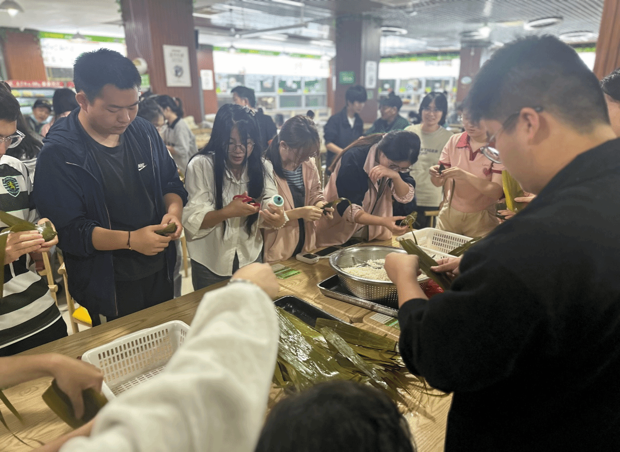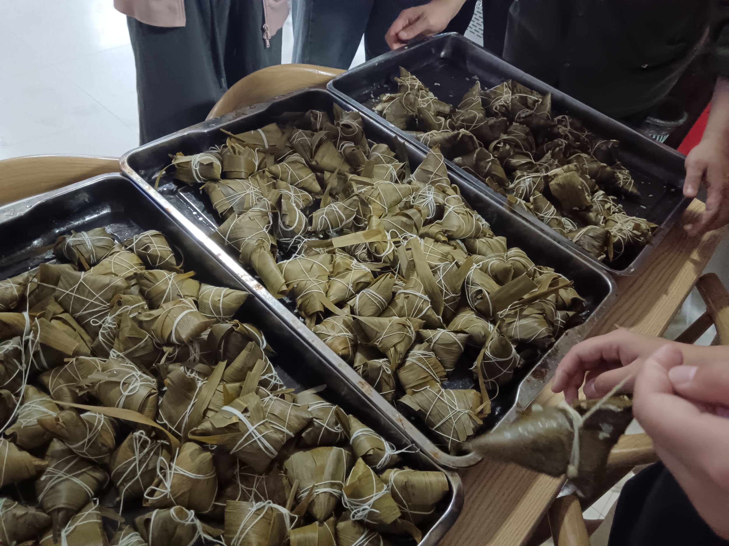 活动伊始,食堂工作人员向同学们教授了粽子制作方法,随后大家开始进行分组制作。同学们在包粽子过程中互相帮助,依据不同的口味于粽叶中放入不同的馅料。最后,在食堂工作人员的帮助下,粽子被放入蒸笼完成制作。同学们大快朵颐、共同分享了亲手制作的粽子,在班级的温暖中也体悟到了节日的氛围。