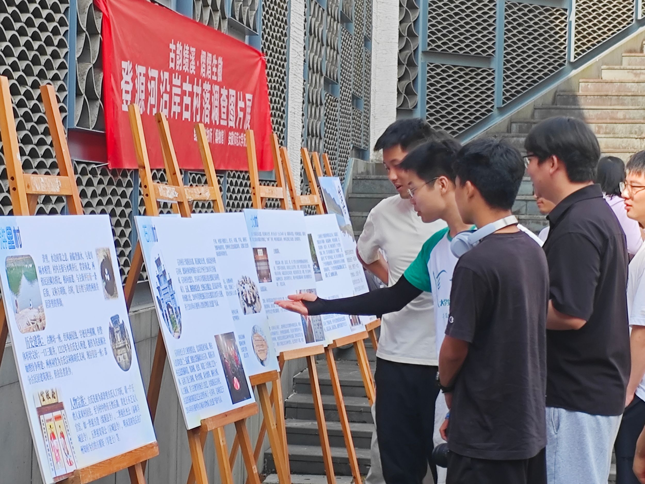谈古论今,记录时间的痕迹。本次展览内容涵盖了登源河沿岸村落简介、特色民俗、河流生态、古建保护等方面,通过精选的图片和生动的文字,展示了古村落与自然山水相融的美丽景观和人文之美。每一个古村落都有其独特的徽派建筑风格,包括亭、桥、井、祠、社及民居等;村落中的石雕、砖雕、木雕工艺精湛独特,为参观者呈现了一个充满历史沧桑与文化传承的徽州。团队以精选的图片和生动的文字捕捉古村的景观之美、人文之美,吸引了众多参观者感悟绩溪、回味绩溪。在仁里村的展板上,描述了千年仁里的历史概况、生态风光、乡风民俗、产业振兴,希望参观者能通过感受仁里村传承的家风文化、了解当地的风俗习惯,寻找古时仁里记忆,体味古村落的振兴之路。队员详细的介绍下,参观者直观领略徽派建筑之美,感受徽文化的独特魅力,体验古村落的历史与未来。有参观者表示,“这次的展览,让隐秘山峦中古村落跃然眼前,感受到了世外桃源一般的质朴静谧,勾起了自己心头的乡愁。”