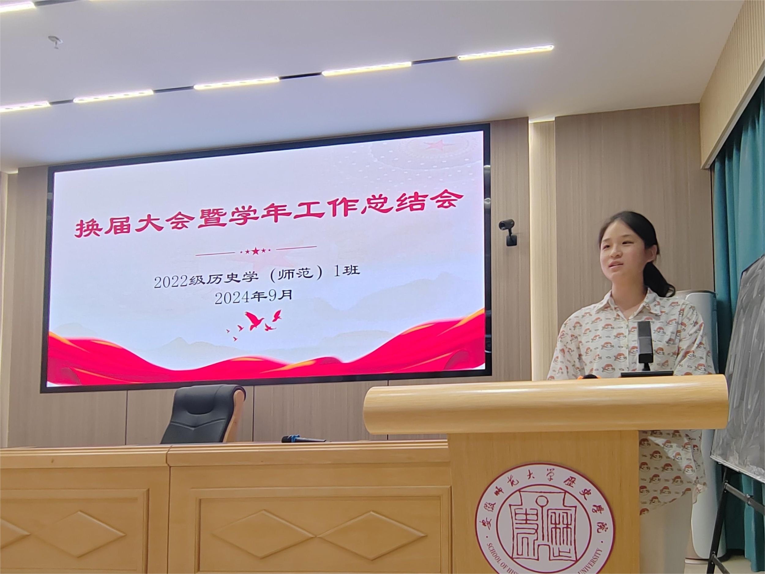 本网讯(图/潘婧怡 文/彭伟轩)为总结大二学年班级建设经验,激发班委工作热情,提高班委工作能力,22级历史学(师范)1班于2024年9月20日召开2024-2025学年班委换届会暨2023-2024学年工作总结会。会议由班长安紫涵主持,辅导员朱晓华老师全程参与,历史学(师范)1班全体同学参加。