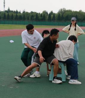 活动伊始,参与活动的同学被分成了四组,主持人详细宣读了游戏规则并安排了游戏进程。首先进行的是抢椅子游戏,每组出场4人,共分为四轮。同学们在音乐声中围绕着椅子紧张地转圈,在音乐停止的瞬间迅速抢占座位,现场气氛热烈。 趣味火车游戏紧随其后,每组5人一列,同学们一手抓住自己一只脚踝,一手搭在前面同学肩膀,依次站成一列,单腿跳跃向终点进发。大家齐心协力,争分夺秒,用时最少的小组获得胜利。两人三足游戏则需要让两位同学通过默契配合迅速冲线。同学们肩并肩,脚绑脚,共同迈向终点,在合作中增进了彼此的友谊。丢手绢游戏将现场气氛推向了高潮。同学们被分成两组同时进行,首先选一人拎着手绢,在圈外慢跑。音乐响起,现场充满了紧张与期待。音乐停止后,丢手绢的同学悄悄把手绢丢在其中一个人的身后,然后继续移动。被丢手绢的同学迅速反应,起身追赶,大家热情高涨,欢声笑语回荡在田径场上。最后一个游戏是拔河比赛,同学们分为两组展开激烈争夺。大家齐心协力,喊着口号,用力拉绳,充分展现了团结协作的精神。