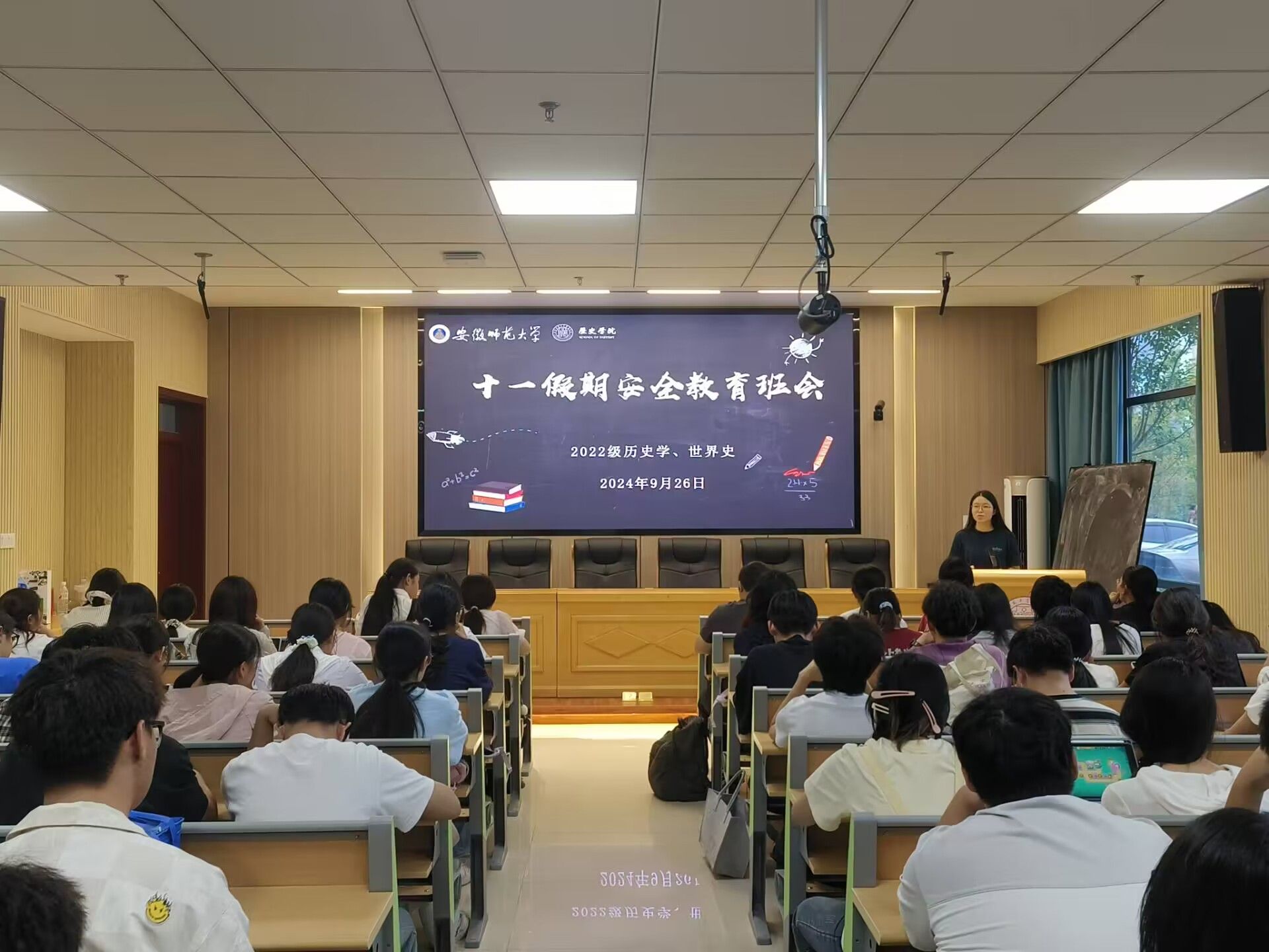本网讯(图/文 彭伟轩)为切实做好国庆假期安全教育工作,引导员工学习安全知识,增强安全防范意识和自我防护能力,确保员工们度过一个安全、愉快的假期。9月26日,22历史123班及世界史召开了十一假期安全教育班会。会议由辅导员朱晓华主持,22历史123班及世界史全全体同学共同参与。