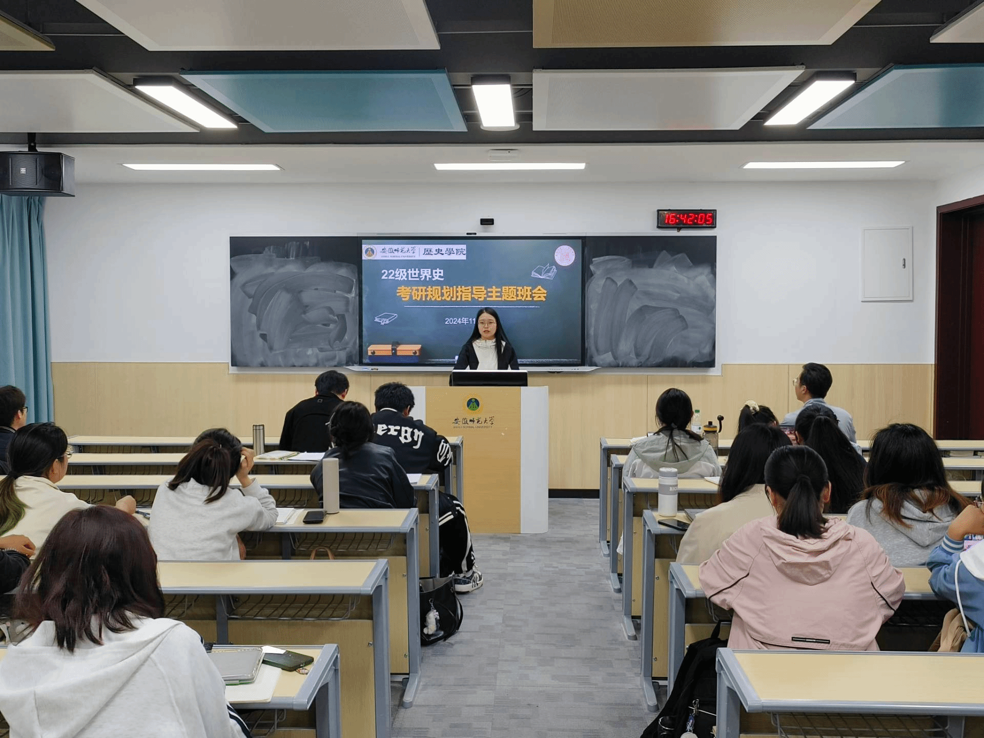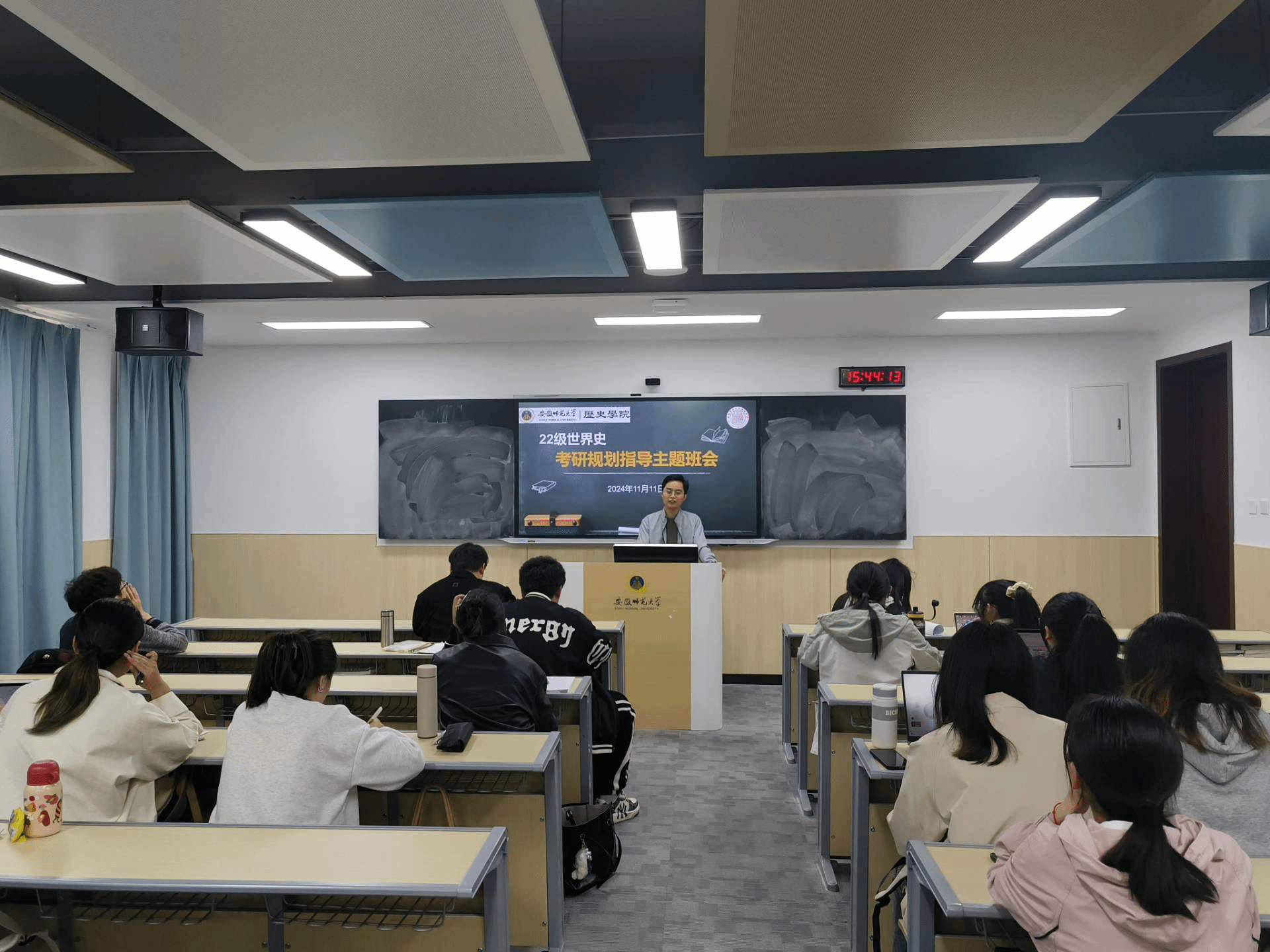 本网讯(图/文 汤泽毓)11月11日下午,为充分了解2022级世界史同学的考研意愿,向同学们科学分析当下考研升学形势,为同学们有序高效备考提供规划指导,2022级世界史班于望道楼C203举行考研规划指导主题班会。会议由班主任詹瑜松老师主持,辅导员朱晓华老师出席,全体同学与会。
