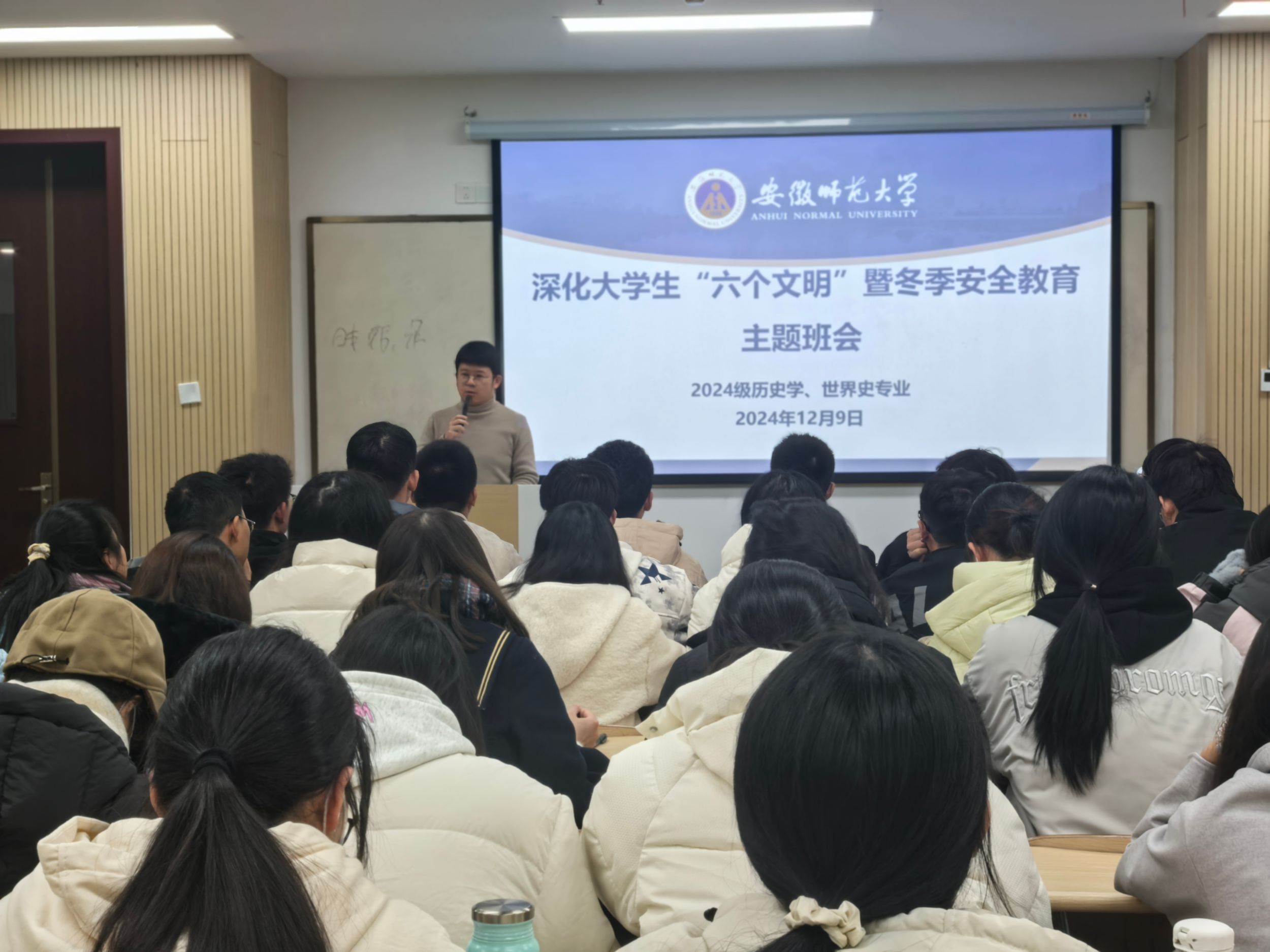 为深入推进老员工护航行动计划,进一步引导员工形成良好的文明习惯,营造安全有序、文明卫生的校园育人环境,2024级历史学、世界史专业于12月9日晚,分批次在各班自习教室开展了深化老员工“六个文明”暨冬季安全教育主题班会,全体员工参会,会议由辅导员郭忠尧主持。