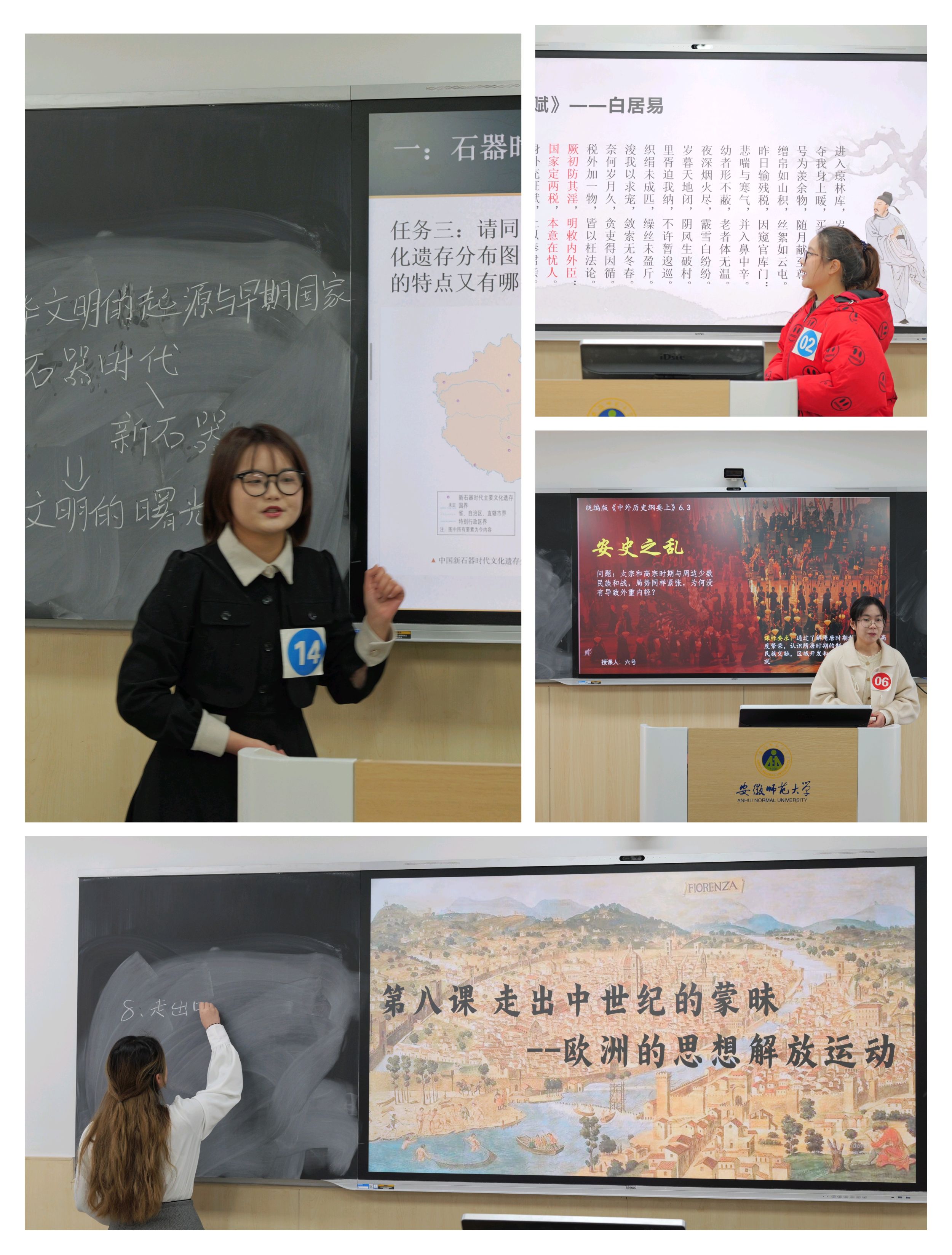 本次比赛由选手从中学课程标准中自选一个子目进行大约15分钟的教学展示。讲课过程中,选手们充分展现了自己的风采。既展现了扎实的专业学识,也体现出卓越的教学技能,为评委和同学们呈现了一场精彩的教学比拼。同时,部分选手创新性地引用了多元的教学素材,丰富了自己的授课内容,也让自己的教学体系更加完整。选手们的精彩表现赢得了评委们的肯定和赞许。最终刘天意、杜若菲等13位同学顺利进入决赛。