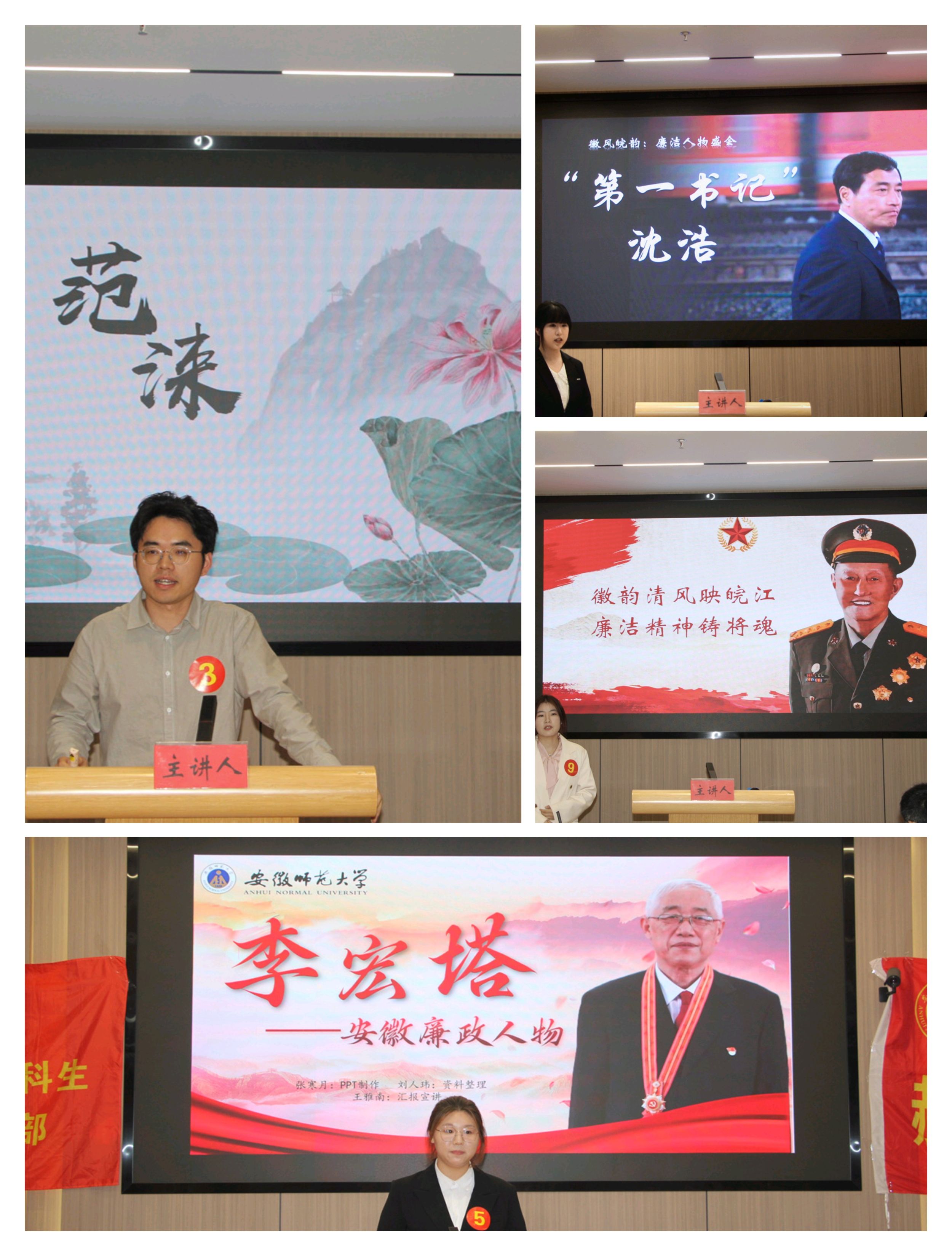 经前期初赛选拔,共有12位选手晋级决赛,选手们围绕“廉洁人物”这一主题,通过宣讲的形式分享了安徽历史上古往今来典型人物的清正廉洁故事。“铁面无私”包青天、“铁骨谏臣”方震孺、“六星上将”洪学智、“第一书记”沈浩……一个个质朴感人的故事,引发了在场同学的情感共鸣,让大家在潜移默化中接受了一次深刻的廉洁教育。宣讲中,选手们不仅讲述了他们的事迹,更结合时代、结合实际、结合专业,思考了如何在高校开展廉洁文化建设,通过古今对照、以古鉴今,引导观众自觉传承、弘扬、践行廉洁文化,为构建风清气正的校园环境贡献青春力量!