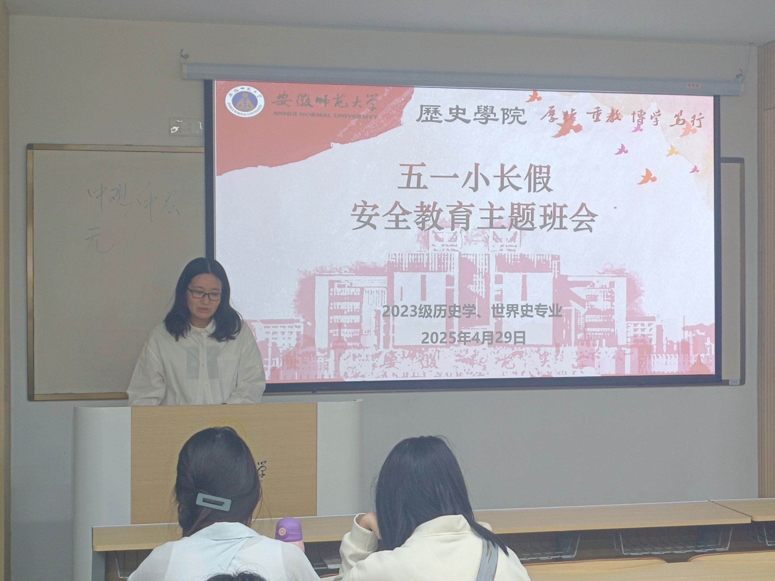 本网讯(图/文 刘维/刘奕轩)聚焦增强安全防范意识,提升安全防范能力,2025年4月29日,2023级历史学、世界史专业分班级召开“五一小长假安全主题班会”,班会由2023级辅导员胡文新主持,班级全体同学参加。