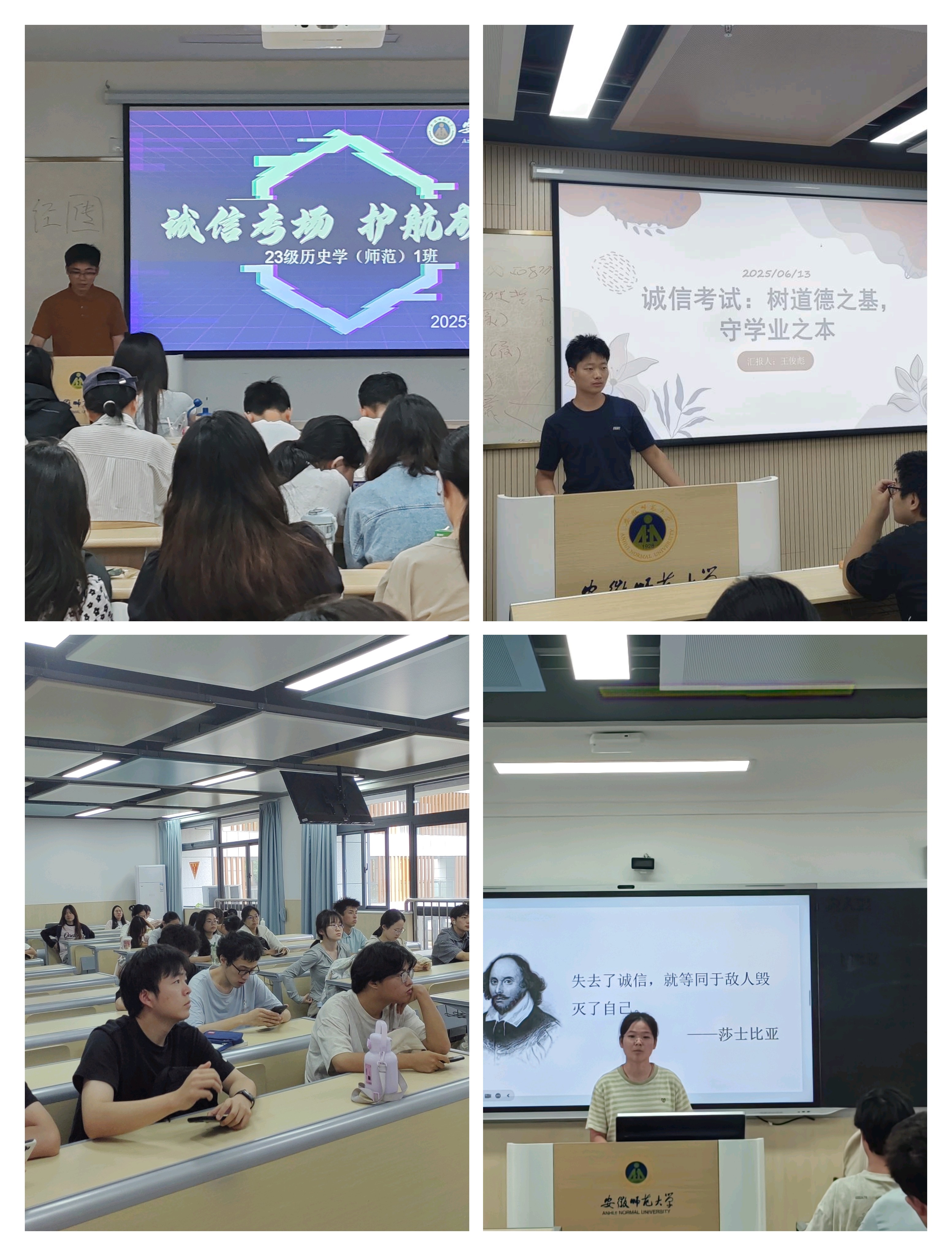 临近期末考试,为进一步增强同学们的诚信意识,营造诚实守信的良好氛围,2023级历史学、世界史专业各班于6月中旬召开了“诚信教育”主题班会。本次班会由各班班委策划、班长主持,班级全体同学参加。