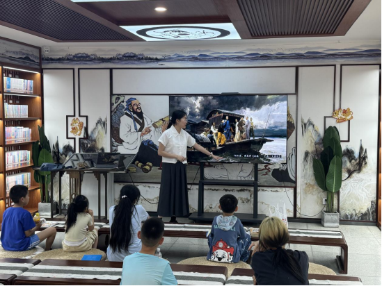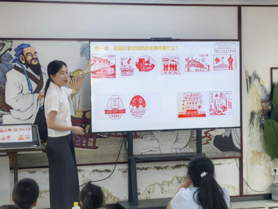 在对中共一大的历史讲解后,刘利回归现实,巧妙呈现博物馆印章来梳理党百年奋斗历程中的重大事件,拉近了孩子们心中与红色文化的距离。课堂的最后,刘利以百年前的革命青年与当代 “七一勋章 ”获得者为精神标杆,号召小朋友们跨越历史长河,在中国式现代化的实践中,将宝贵的建党精神进行代际传承。