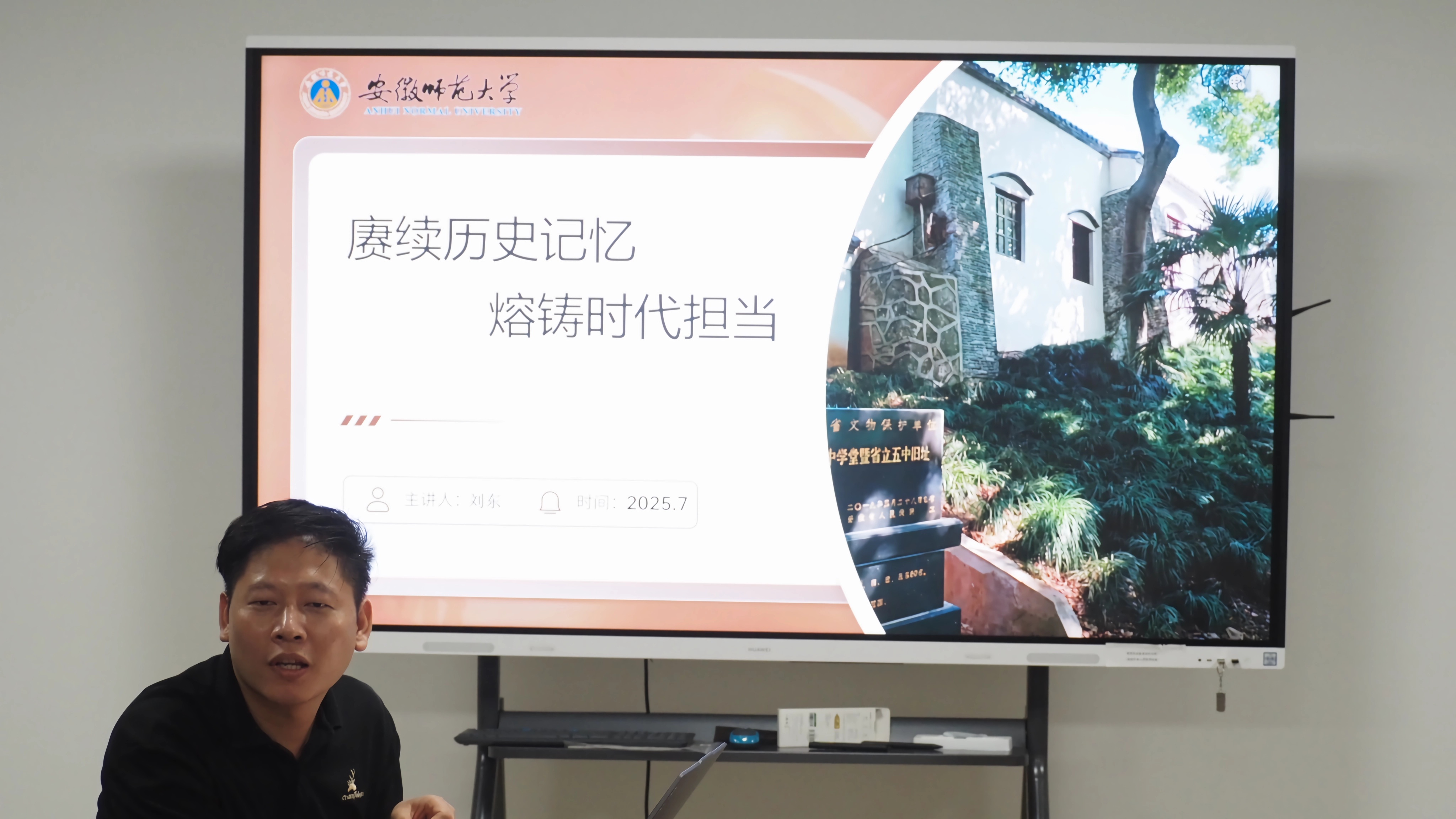 刘东老师简要概括总结了同学们的分享,并强调经过暑期社会实践的洗礼,大家更应注重思想升华。他高度凝练了芜湖城市发展中西结合的特点与建筑遗址中蕴藏着的进步与革命火种,又向团队补充了白茆乡胡家瓦屋等红色文化基地,拓展了调研视野。最后他从两个方面给予了团队后期调研的建议。一方面,他建议团队立足于历史学专业优势,在扎实掌握理论知识的基础上,勤于田野调查搜集一手史料,对历史产生更鲜活更深刻的认识,做到知行合一。另一方面,他提到暑期社会实践是宝贵的学习成长机会,大家应发展各项技能,培养跨学科思维,并将自身所学与实践所得的成果进行转化,以青年力量服务社会。