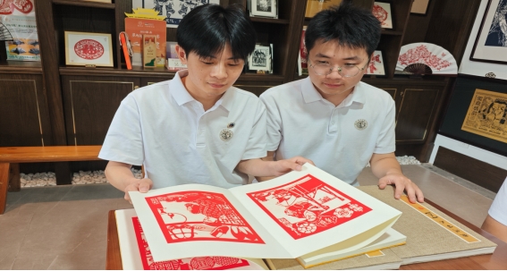 最后,吴笑梅老师带领调研团队前往徽州府的工作室。在这里,队员们近距离观察剪纸团队的日常创作。团队成员细致询问了从设计构图到成品装裱的完整流程,亲眼见证一张宣纸如何在多样工具的作用下,蜕变为兼具艺术感与文化味的作品。工作室里,不仅有传统的单色剪纸,更有融入现代审美的套色、填色作品,队员们深刻体会到,徽州剪纸早已从民俗装饰走向生活美学,从茶叶包装到丝巾服饰,从陶瓷茶盏到非遗跨界合作,传统技艺正以多元形态融入当代生活。