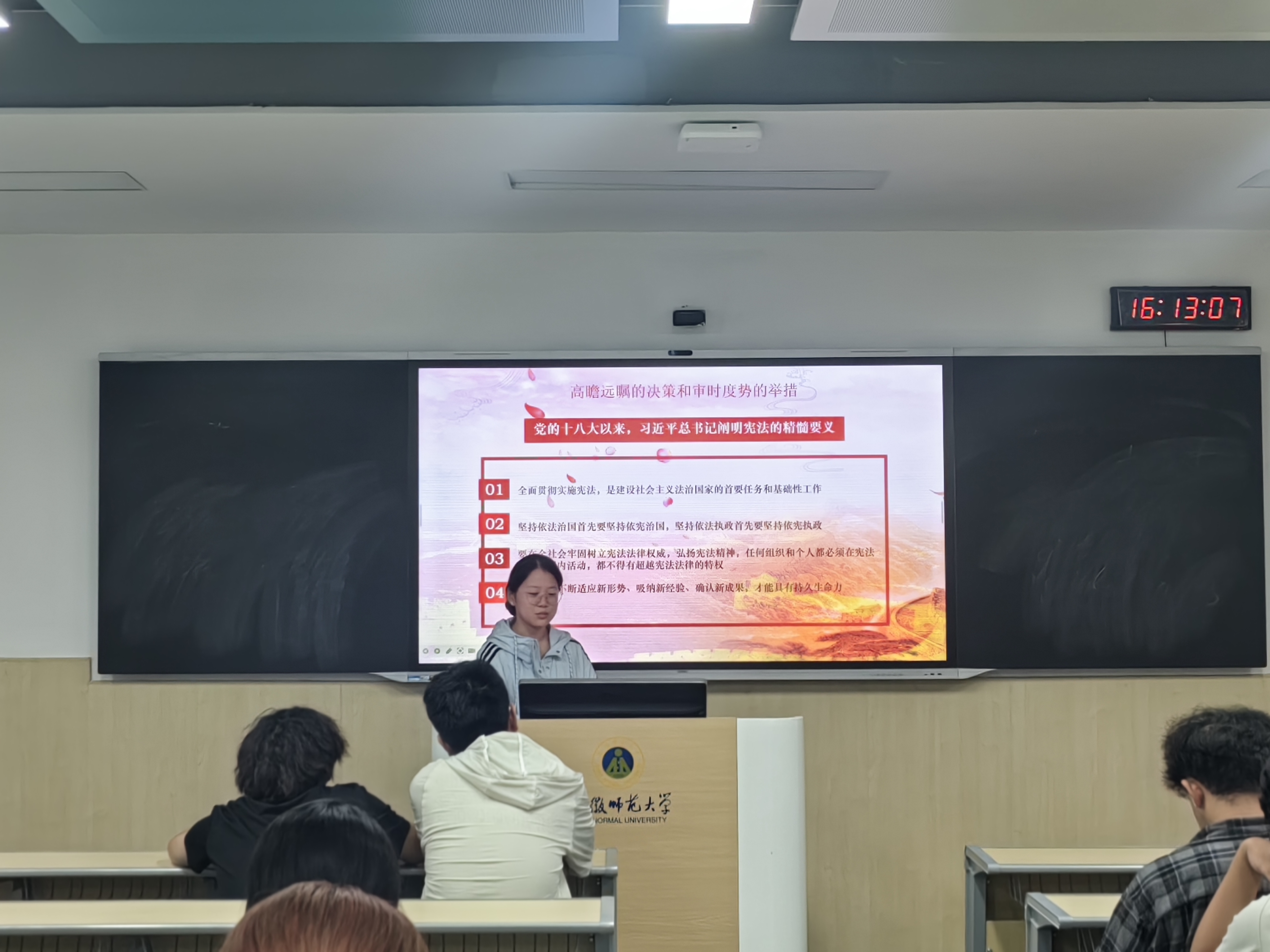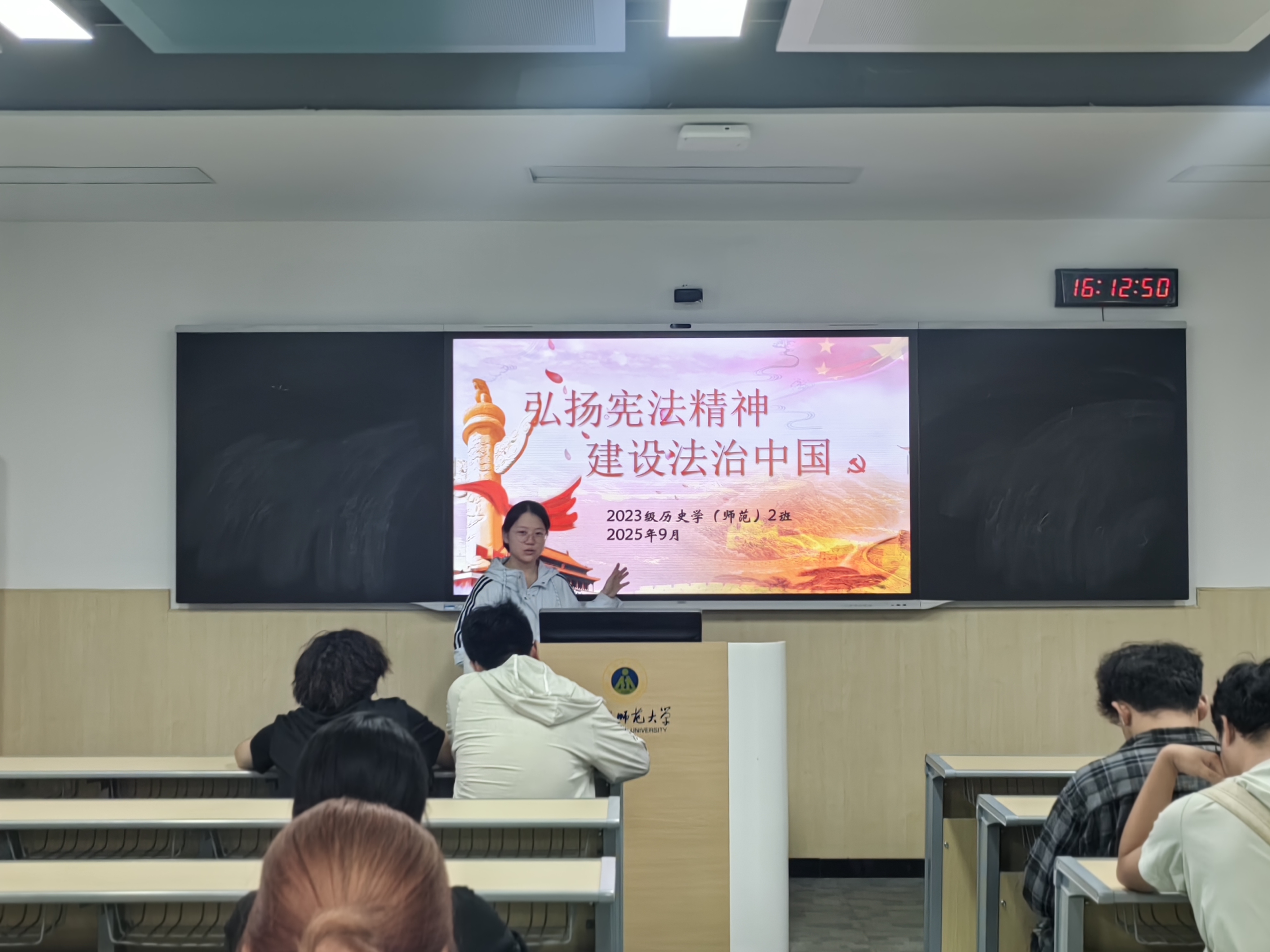为深入学习贯彻习近平法治思想,引导青年员工树立宪法意识,以法治力量护航成长之路,2023级历史学、世界史专业于9月下旬分班级召开了以“守望成长,法治护航”为主题的宪法学习班会。本次活动由各班团支委谋划,班级全体成员参加。