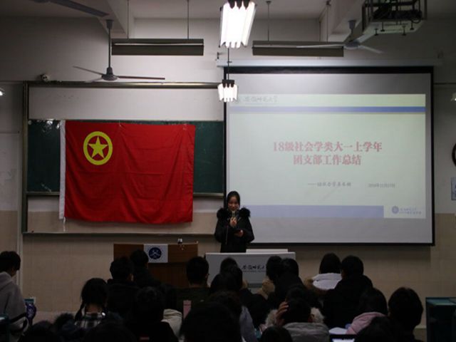 汇报第二项,团支书朱妍分别从“我们的成员、我们的工作、我们的未来”三方面进行支部工作总结。首先她介绍了班级团支部的组成成员,包括宣传委员等六位班委和六位团小组组长。随后她系统地介绍了本学期团支部的工作成果:每月举办团日活动,本学期共举办“我与改革共成长”等四次团日活动。共召开团支部会议六次,主要商讨秋季生日会、趣味运动会、主题团日活动等活动细节,积极配合班委的班级建设活动。并且在辅导员韩雪的引导下进行“不做青年官、争做青年友”的团支部学习。而后,朱妍表示团支部将吸取本学期的经验教训、继续发展优势,不断改进工作中的短板,解决实际问题,争取在下学期看到一个更加昂扬向上的18级社会学类团支部!