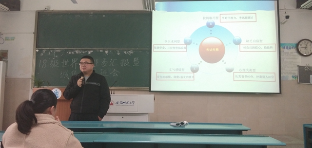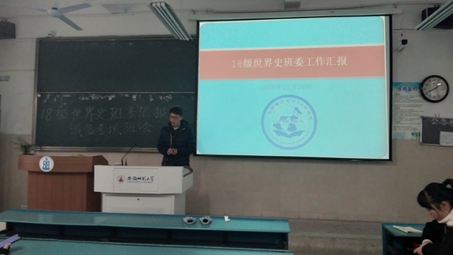 本网讯(18世界史 华婉蓉)为严肃考风考纪,引导员工诚信考试,同时让班级同学了解班级工作进展和明白诚信考试的重要性。12月28日2018级世界史在2040102教室召开了班委述职暨诚信考试主题班会,世界史全班同学参加此次班会。