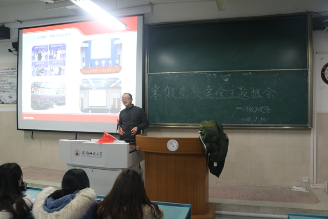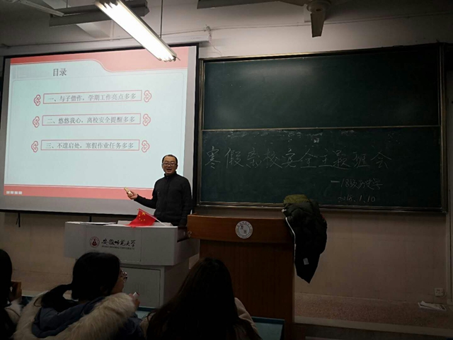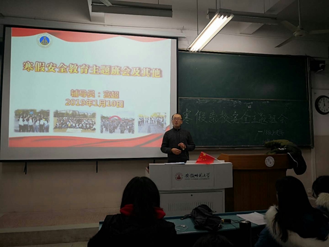 本网讯(2018级历史学)随着期末考试的结束,寒假即将来临,为提高员工的安全意识,帮助他们平安返乡、合理规划寒假生活,1月10日晚上,2018级历史学专业召开“寒假安全教育主题班会”,全体同学参会,辅导员宫超主持会议。