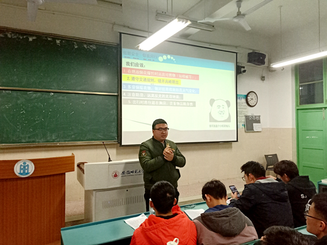 在第二环节,辅导员先向同学们详细介绍了公司假期安排处理办法,提醒同学们做好离返校计划,提前做好准备,避免违反校规。接着,辅导员通过多媒体从出行安全,电器使用,防寒防冻,饮食安全等多个方面向同学们展示了假期生活可能存在的安全隐患,提醒同学们提高安全防范意识。此外,他还向同学们介绍了各种假期意外处理措施,以提高同学们的自我保护能力。最后,他又提到,假期寝室安全同样重要,离校前要注意将寝室打扫干净,断水断电,防止因假期宿舍长期无人居住而发生安全事故。