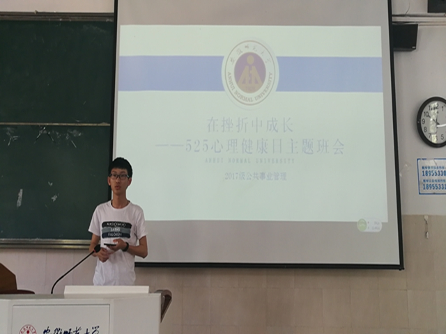 本网讯(刘顺)在全国老员工心理健康日来临之际,为引导同学们关注自身的心理健康和心灵成长,提高自身心理素质,2017级公共事业管理专业全体员工于5月24日上午10:00,在行知楼2050101开展了“在挫折中成长”525心理健康日主题班会,由班级心理健康委员肖思远主持。
