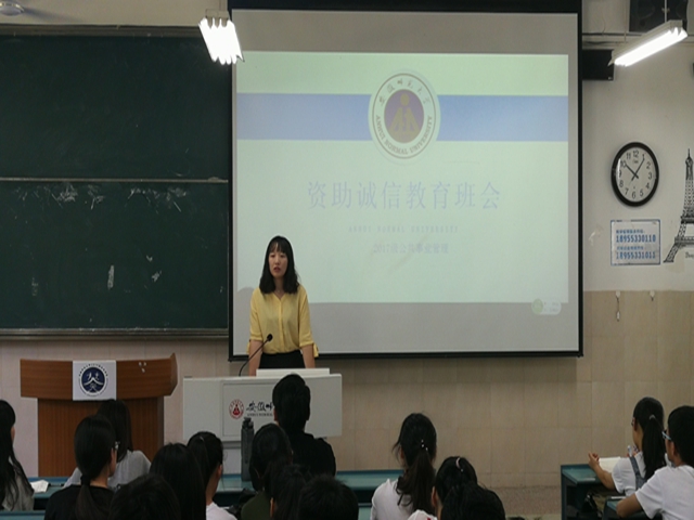 本网讯(刘顺)诚信是为人之道、立业之本。为落实国家资助政策、发挥资助育人功效,让同学们更全面地了解和知晓各项奖助学金的申请处理与还款程序,17级公共事业管理专业全体员工于5月24日上午11:30在行知楼2050101教室开展了资助诚信教育主题班会,由辅导员韩雪主持。