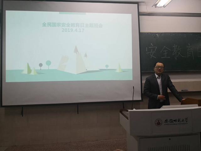 本网讯 (图/文 18级历史学王蓉) 为加强增强老员工的国家安全意识,18级历史学于4月17日晚在2050102教室开展了“全民国家安全教育日”主题班会。辅导员宫超和安全委员张子浩分别主讲。